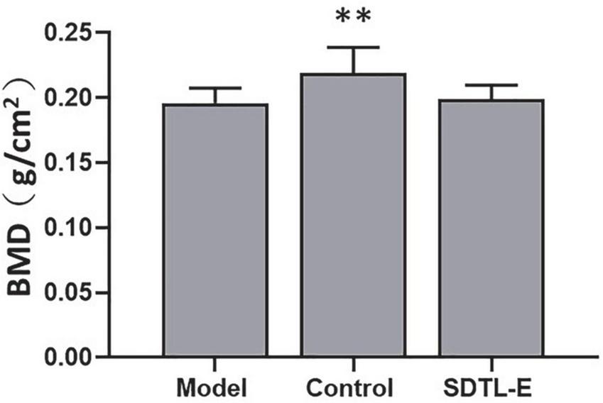 Three months after Model Group and SDTL-E Group rats were OVX, BMD was measured before treatment. The BMD of Model Group and SDTL-E Group were significantly lower than the Control Group (p < 0.05) (Table 1), indicating the OVX-induced osteoporosis rat model was successfully established.