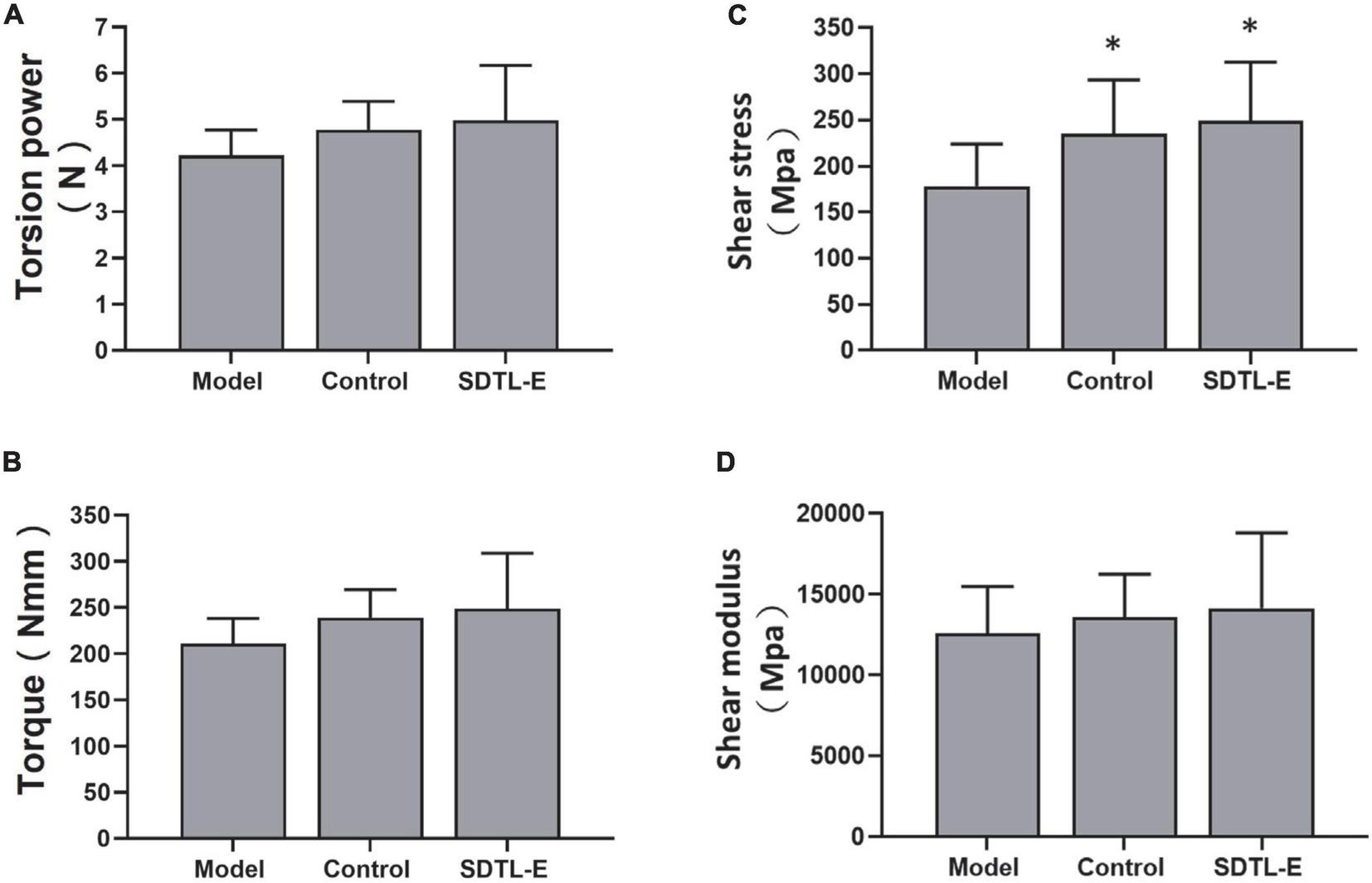 Bone torsional testing results showed shear stress of Model Group was significantly lower than that of the Control Group (p < 0.05) (Supplementary Table 1 and Figure 7C). Torsion power, torque and shear modulus of Model Group were lower than that of the Control Group, but the differences were not statistically significant (Supplementary Table 1 and Figures 7A,B,D). Compared to Model Group with shear stress of 178.281 ± 45.672 Mpa, shear stress of SDTL-E Group rats after 20 days of SDTL-E treatment was 249.502 ± 63.445 Mpa, significantly higher than that of the Model Group by 39.93% (p < 0.05) and was similar to the shear stress of the Control Group of 235.540 ± 58.097 Mpa (Supplementary Table 1 and Figure 7C). Torsion power, torque and shear modulus of SDTL-E Group were similar to that of the Control Group and were higher than that of the Model Group but the differences were not statistically significant (Supplementary Table 1 and Figures 7A,B,D). These results indicate that topical treatment of SDTL-E for 20 days can increase bone strength in OVX-induced osteoporosis rats.