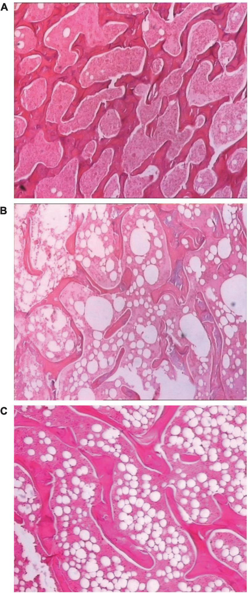Figure 8A shows a clear structure of osseous tissue of the Control Group rats, the trabecular bones were thick, darkly stained and densely aligned, the interspaces of trabeculae were small and filled with red bone marrow indicating active blood production. Figure 8B shows the structure of osseous tissue of the Model Group rats, when compared with the Control Group rats, the number of trabecular bones decreased, the trabecular bones were lightly stained, shrunk, fractured and sparse, the interspaces of trabeculae were widened, fatty tissue increased with fewer red bone marrow indicating low blood production. Figure 8C shows the structure of osseous tissue of the SDTL-E Group rats, when compared with the Control Group rats, the number of trabecular bones decreased, the trabecular bones were lightly stained, shrunk, fractured and sparse, the interspaces of trabeculae were widened, fatty tissue increased with fewer red bone marrow indicating low blood production, however, when compared with the Model Group rats, the number of trabecular bones and trabecular bone thickness showed a slight increase, studies with longer duration will be needed to investigate longer term effects of SDTL-E on osseous tissue structure of OVX-induced osteoporosis rats.