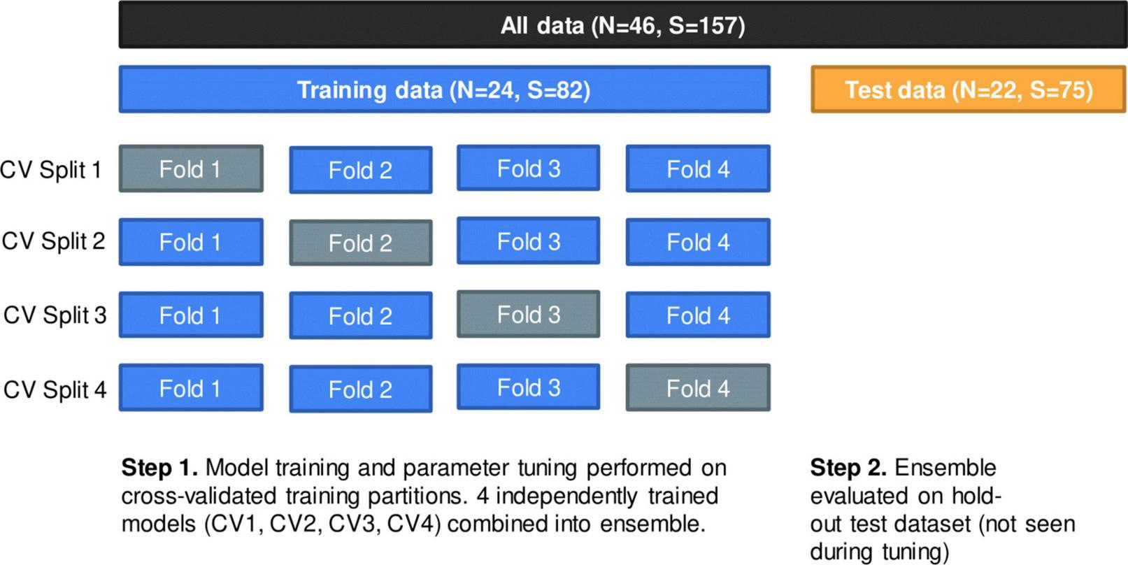 Figure 2. Data partition using group fourfold cross-validation (CV) method. Within training data, each split represents one independently trained model. Models were evaluated on a hold-out test dataset of 22 patients (75 samples).