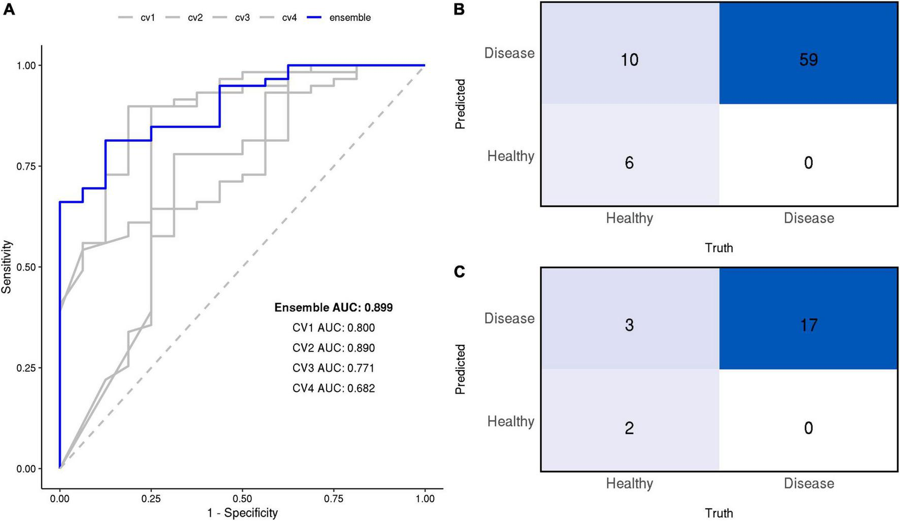 Figure 4. (A) Receiver operating characteristic (ROC) curves of the final models at the sample level. Area under the ROC curve (AUC) is annotated for each model. The ensemble’s confusion matrix heatmaps at the sample (B) and patient (C) levels summarize the frequency of True Positives (TP), False Negatives (FN), True Negatives (TN), False Positives (FP).