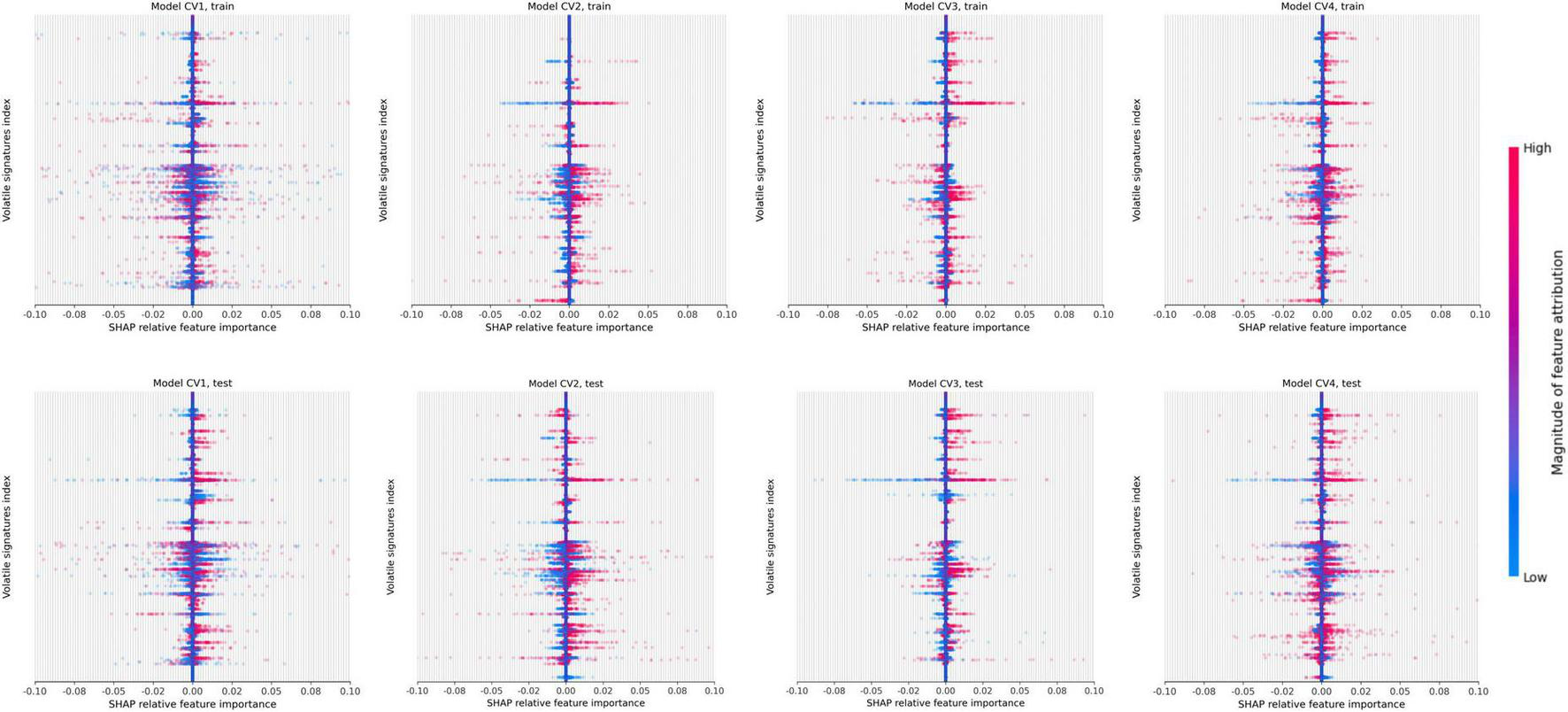 Figure 6. Beeswarm summary plots on train and test data. This plot combines feature importance and feature effects. Every feature (VOC) is represented as a row on the y-axis (3,400 total) and SHAP values are on the x-axis (multiple VOC may overlap at a single index). Each dot represents a Shapley value for a given sample prediction. The color intensity shows the magnitude of importance of each feature.