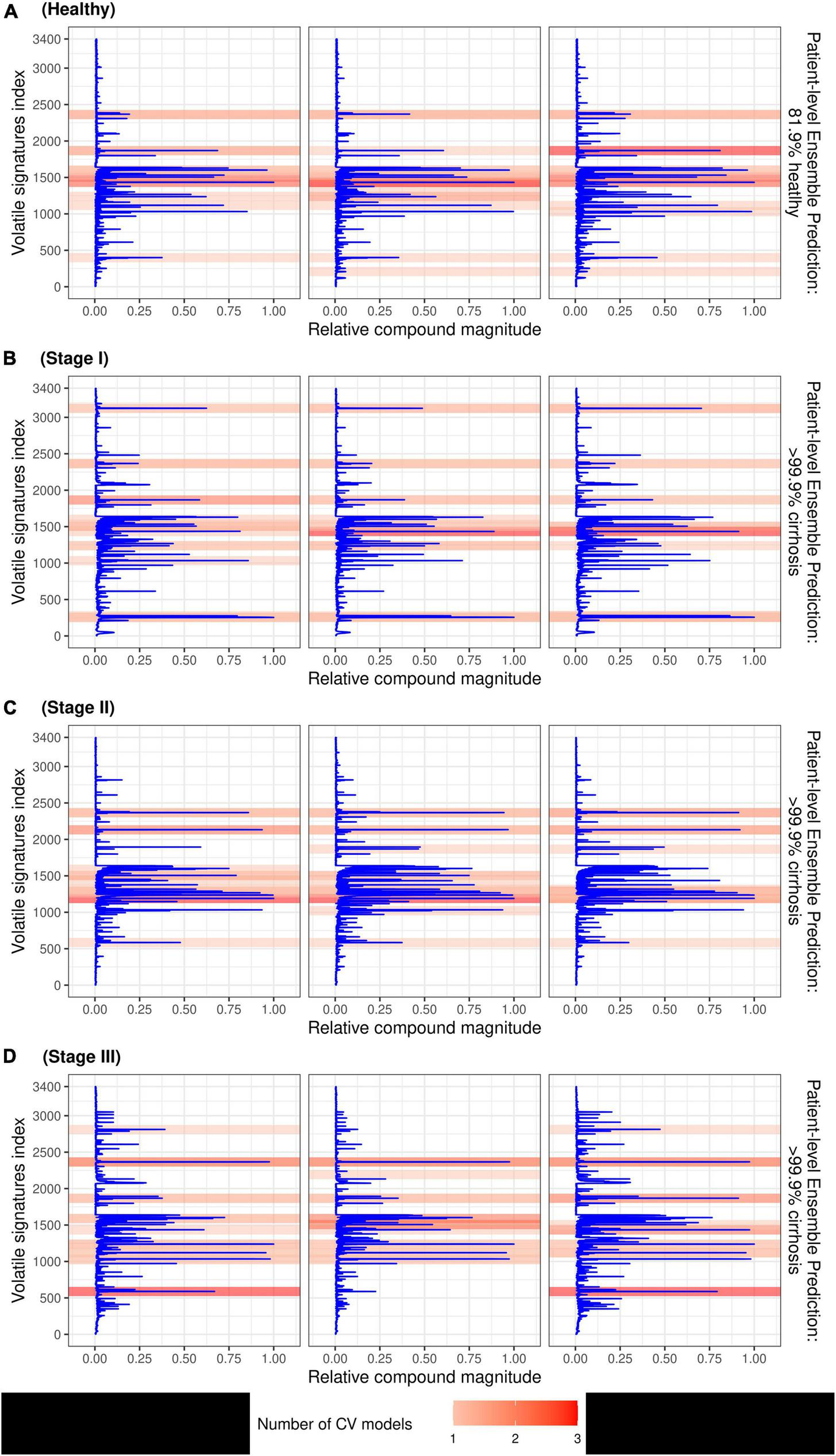 Figure 7. Patient breath samples with overlayed heatmaps which identify the 5 most important peaks from each CV model (up to 20 peaks total) in the classification of liver cirrhosis for a healthy control (A), and 3 individuals with stage I (B), stage II (C), and stage III (D) cirrhosis, respectively. Compounds are represented by indices on the y-axis and VOC signal value is on the x-axis; darker shading indicates the feature was selected by multiple CV models.