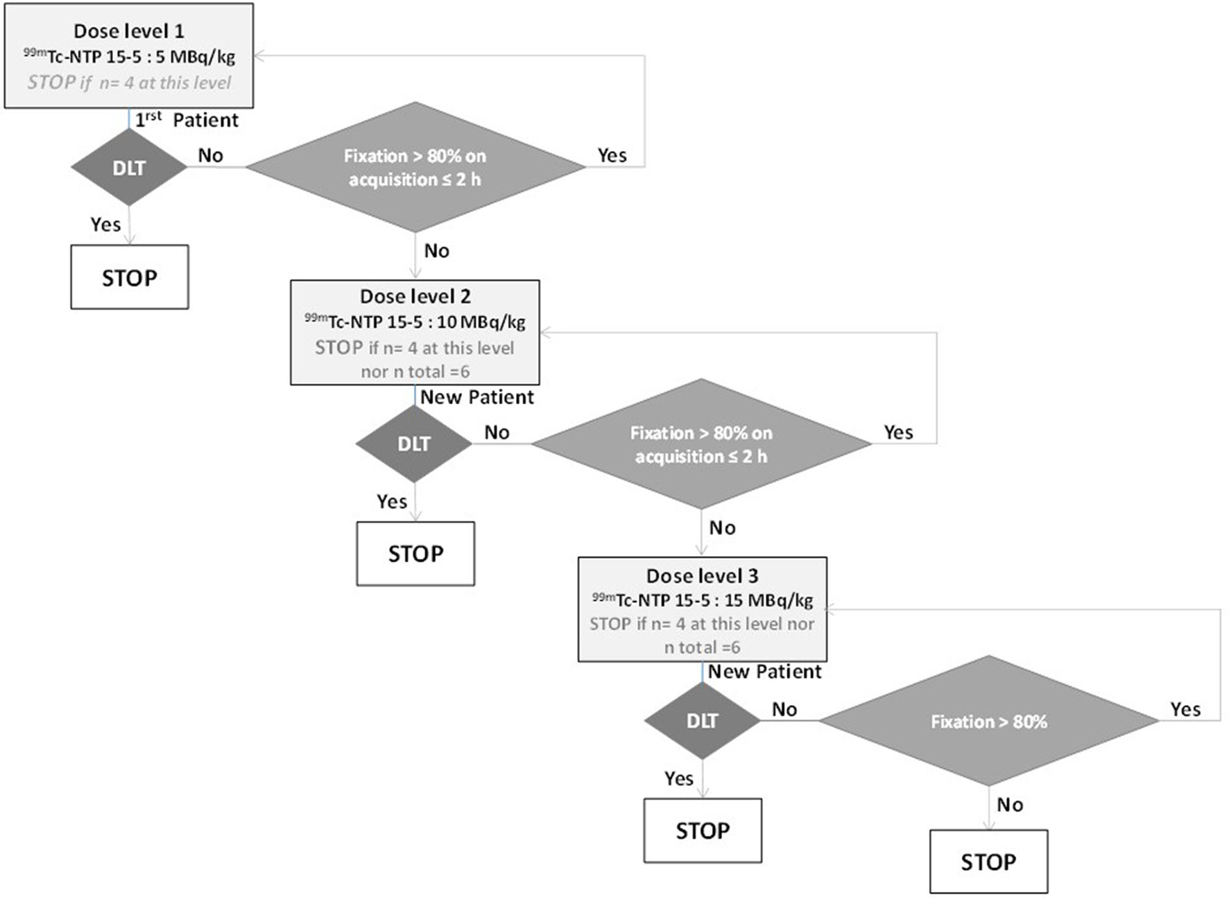 Dose escalation will include 3 activity levels: 5, 10, and 15 MBq/kg. The initial dose of 5 MBq/kg will be used as the first level. The dose escalation scheme will allow dose escalations of one level conditioned by the absence, at the previous level, of dose-limiting toxicity (DLT) and the presence of tracer accumulation in healthy joints appearing on scintigraphy performed at ≤ 2 h post-injection (Figure 1). With a semi-quantitative visual scale, a score of 3 for at least 80% of healthy joints was chosen because it corresponds to a sensitivity of 80%, considered sufficient for diagnostic imaging.