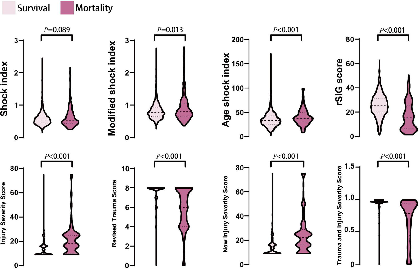 The distribution and density of all prediction score systems in survival and mortality groups was illustrated in violin plot. Inside the violin plot interquartile ranges and outlier whiskers are presented as a thick and thin line equivalent to a boxplot. There were no statistical differences for shock index between survival and mortality groups.