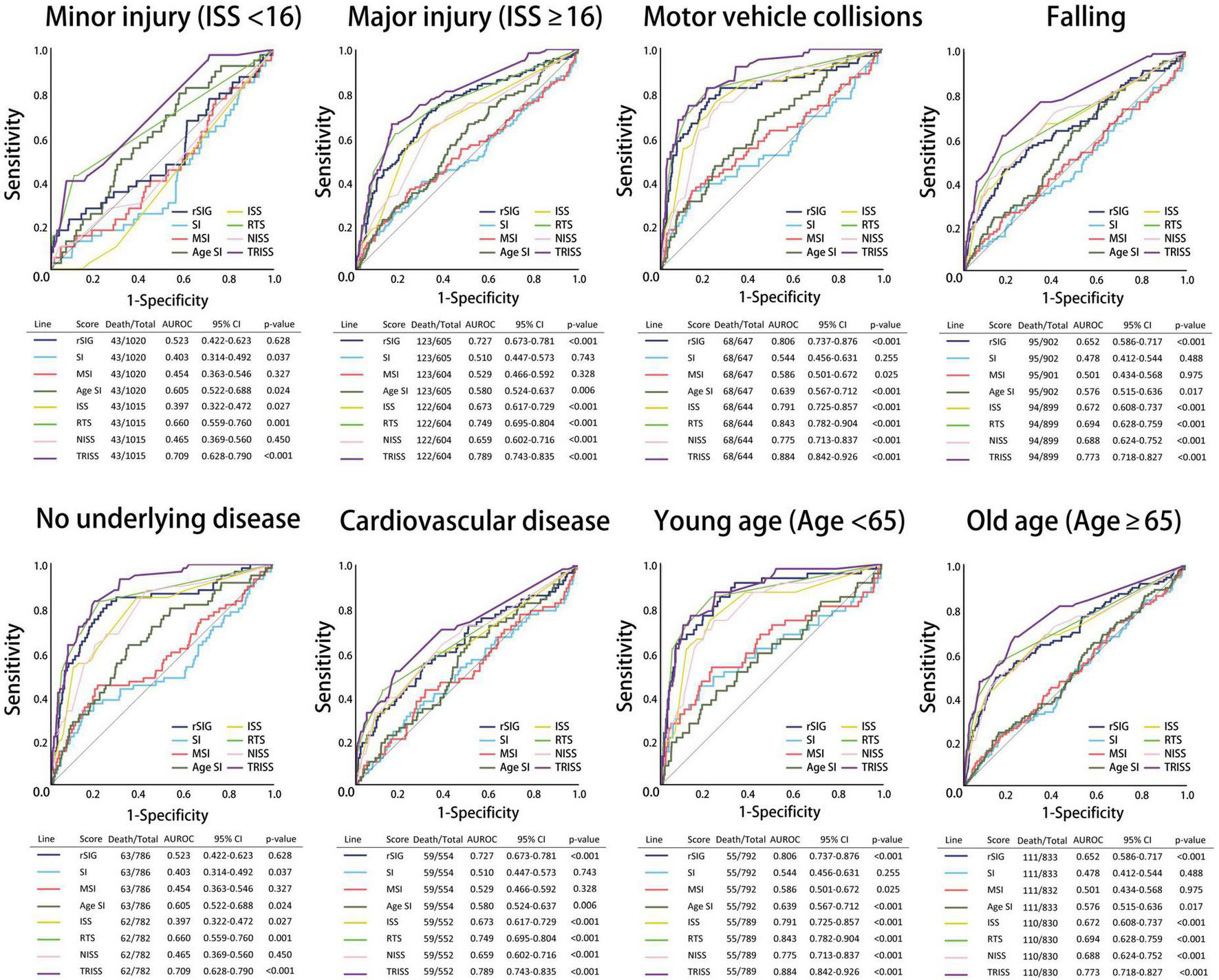 The predictive accuracy of rSIG was significantly higher than those of SI, MSI, and ASI in all the patients [area under the receiver operating characteristic curve (AUROC), 0.710 vs. 0.495 vs. 0.527 vs. 0.598], especially in the moderate/severe TBI (AUROC, 0.625 vs. 0.450 vs. 0.476 vs. 0.529) and isolated head injury populations (AUROC 0.689 vs. 0.472 vs. 0.504 vs. 0.587). In the subgroup analysis, the prediction accuracy of mortality of rSIG was better in TBI with major trauma [Injury Severity Score (ISS) ≥ 16], motor vehicle collisions, fall injury, and healthy and cardiovascular disease population. rSIG also had a better prediction effect, as compared to SI, MSI, and ASI, both in the non-geriatric (age < 65 years) and geriatric (age ≥ 65 years).