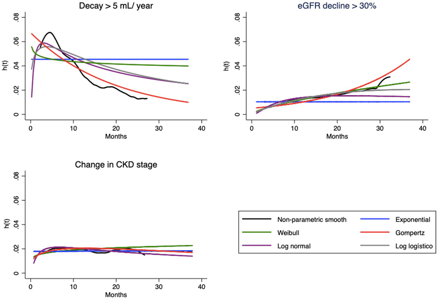 The forms of the survival function and hazard function were calculated according to the models available in STATA: exponential, Weibull, loglogistic, lognormal and Gompertz, always adjusting for the CKD-EPI value at baseline. The models can be compared using an estimated fit measure and visual inspection by graphs. At this point, the nephrologist’s view is important because the curves should represent the expected clinical evolution for the endpoint.