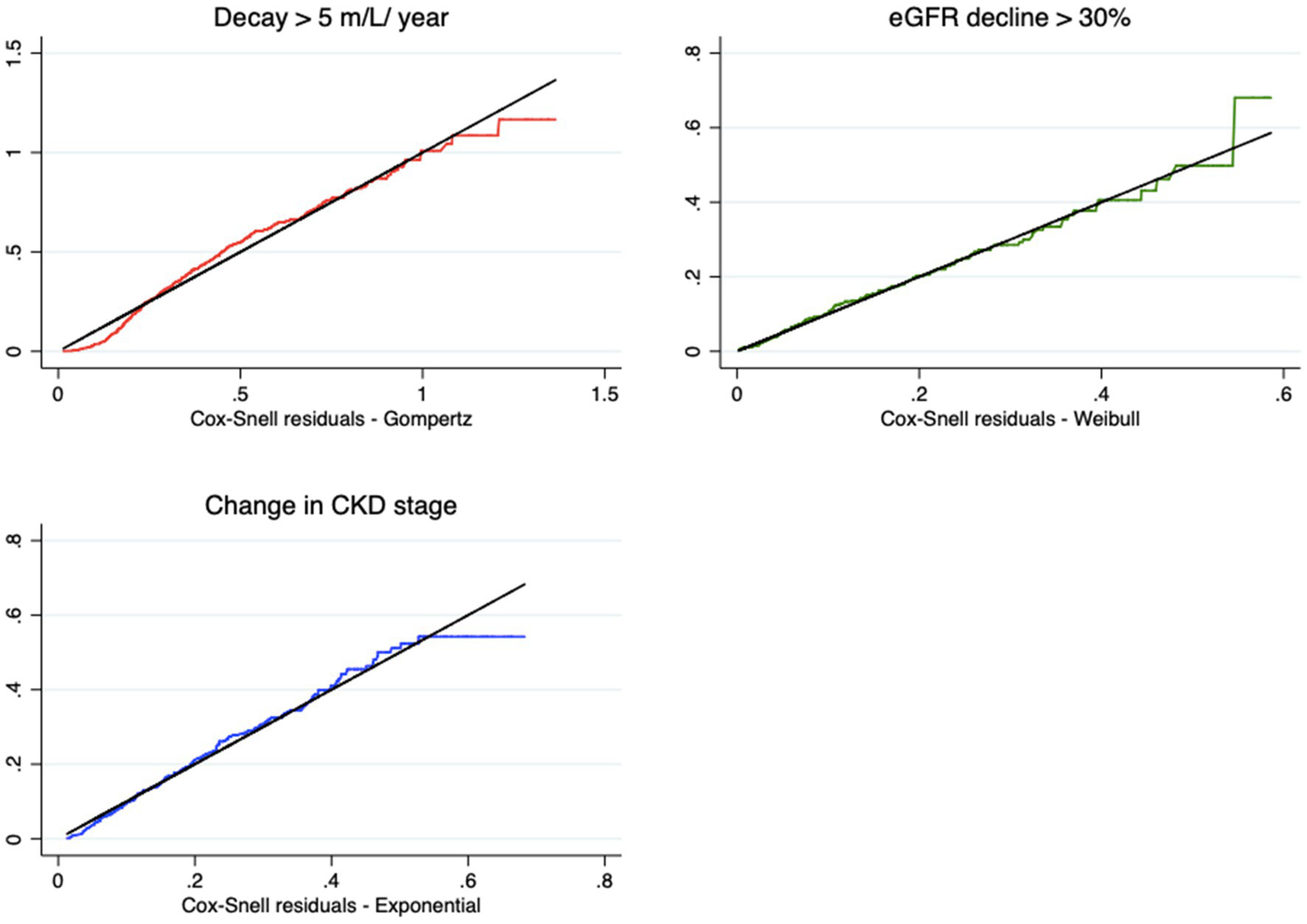 This study proposes the use of parametric survival analysis models with the three most commonly used endpoints in nephrology based on a case study. Estimated glomerular filtration rate (eGFR) decay > 5 mL/year, eGFR decline > 30%, and change in CKD stage were evaluated.