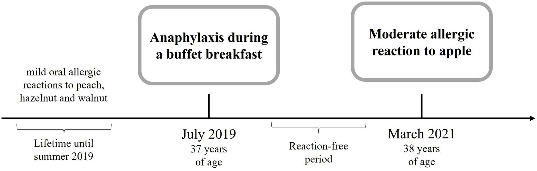 A 37-year-old woman presented to the emergency department with an anaphylactic shock including burning and tingling of her tongue, emesis and diarrhea, generalized urticaria, facial angioedema progressing to dizziness, and difficulties in swallowing and breathing due to swelling of her throat. Her past medical history included lactose intolerance and sensitization to house dust mites, and she also experienced non-allergy related diseases including Hashimoto’s thyroiditis and autoimmune uveitis. The patient neither suffered from allergic rhinitis, asthma, or atopic eczema nor did she take any medication regularly. This anaphylactic reaction happened during a buffet breakfast with a multitude of allergen sources including salmon, pine nuts, walnuts, sesame, wheat, oats, mustard, honey, orange juice, melon, apple, grapes, grapefruit, blood orange, and coffee. Thorough clinical history revealed that the patient underwent physical exercise 60 min before her breakfast. She remained incident-free for more than one and a half years until she presented a second time to a primary care physician with an intense tingling of the tongue after consumption of an apple crumble and coffee (Figure 1). No other LTP-containing foods were consumed in parallel. Almost all the ingredients of the apple crumble she had been eating daily, besides the apple itself, which is why the apple was considered suspicious of being the allergy trigger. This time physical activity as a cofactor was excluded; however, menses and the intake of non-steroidal antiphlogistics are probable. Medical history further revealed that the patient had experienced itchy eyes, an erythematous itchy reaction at her neck, and swelling of her lips after the consumption of peach many years ago, which was her very first allergic reaction. The consumption of walnut and hazelnut was accompanied by oral allergy syndrome, and in the case of hazelnut (hazelnut flour in a bread roll), the eyes were itchy and the lips were swollen in addition to oral allergy syndrome.