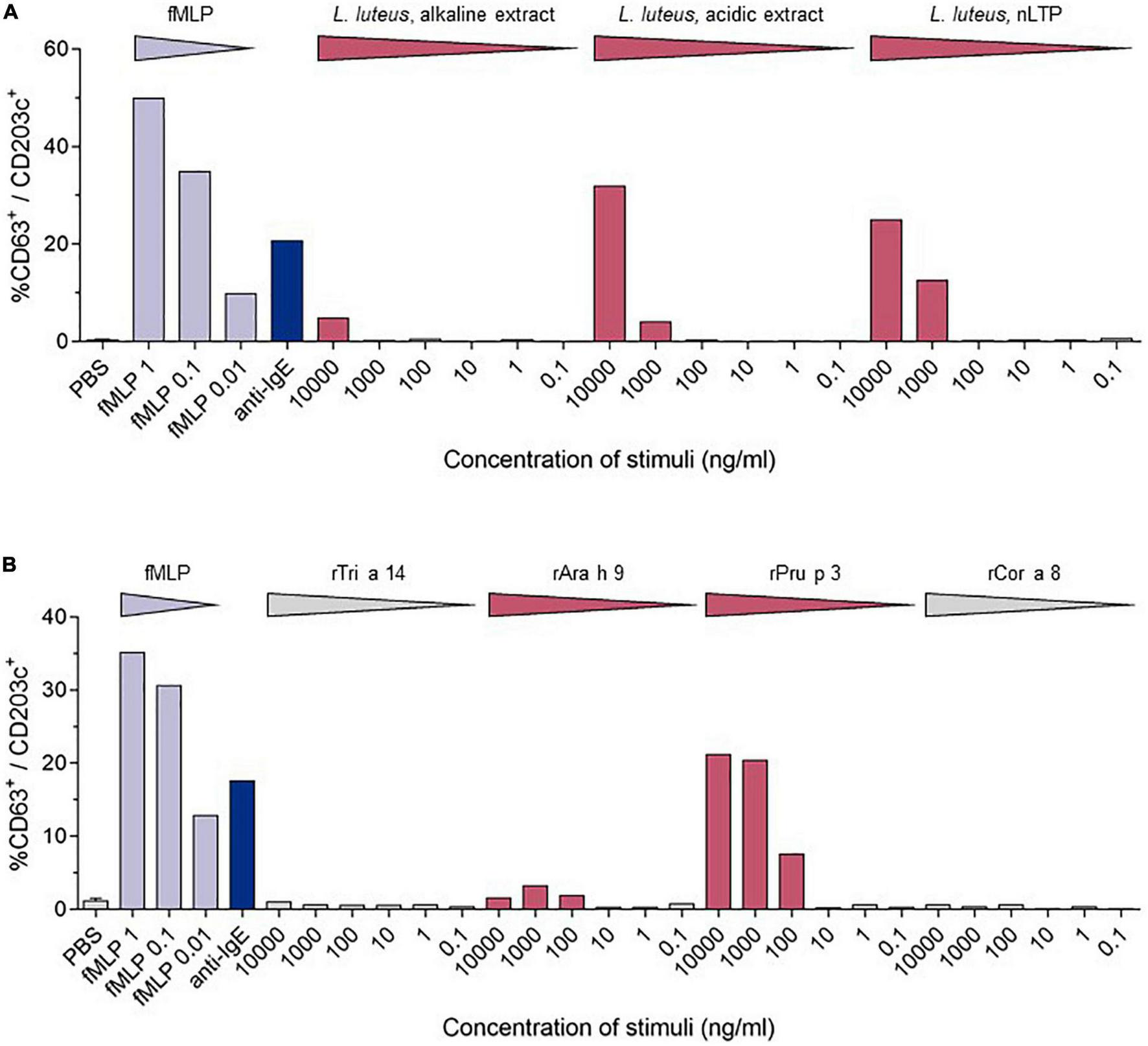 Comparison of the stimulation-induced basophil activation levels. Basophil activation was measured by the percentages of CD63 positive basophils (CD203c+/FcϵRIα+). PBS—phosphate-buffered saline, fmIP- formyl-, methionyl-leucyl phenylalanine. (A) Results of the BAT for LTPs from Lupinus luteus [acidic extract; alkaline extract; nLup l 3 (LTP)] (10). (B) BAT results from wheat (rTri a 14), peanut (rAra h 9), peach (rPru p3), and hazelnut (rCor a 8).