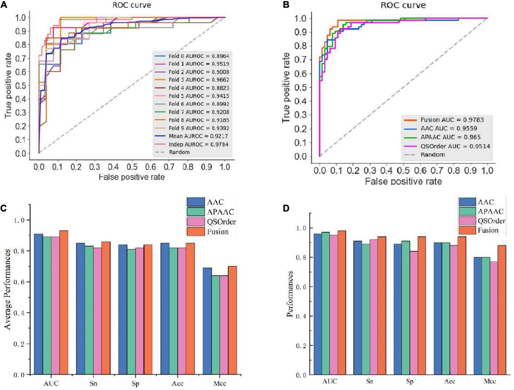 Figure 2. The prediction results using different features. (A) AUROC curves of fused features using RF; (B) AUROC curves of fusion features and three single-feature on independent data; (C) detailed results on training data using 10-fold cross-validation; (D) independent data validated results.