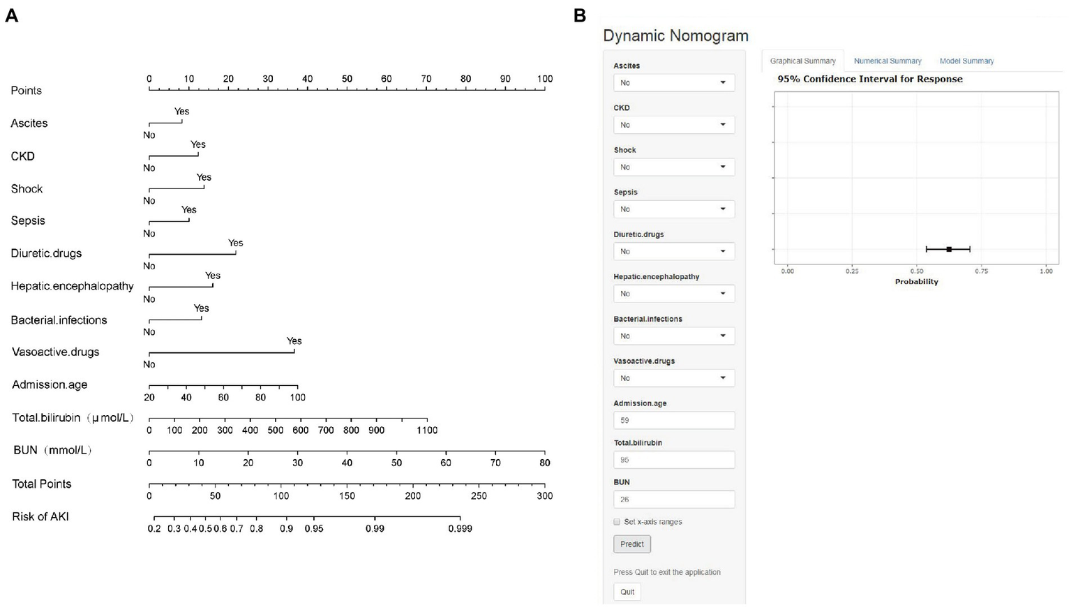 The incidence of AKI in 4,375 patients was 71.3%. Ascites, chronic kidney disease, shock, sepsis, diuretic drugs, hepatic encephalopathy, bacterial infections, vasoactive drugs, admission age, total bilirubin, and blood urea nitrogen were identified using the multivariate logistic regression analysis as significant predictors of AKI upon ICU admission. In the derivation cohort, the model showed good discrimination (C-index, 0.786; 95% CI, 0.765–0.806) and good calibration. The model in the validation cohort yielded good discrimination (C-index, 0.774; 95% CI, 0.753–0.795) and good calibration. Decision curve analysis demonstrated that the dynamic online nomogram was clinically useful.