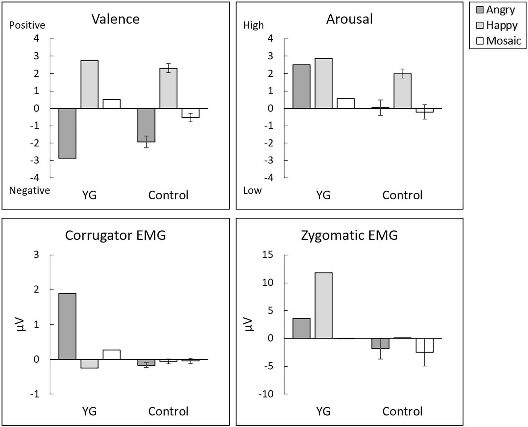 Mean (±SE) subjective ratings of experienced valence (upper left) and arousal (upper right) and electromyography (EMG) activity of the corrugator supercilii (lower left) and zygomatic major (lower right) muscles in response to dynamic angry expressions, dynamic happy expressions, and dynamic mosaics.