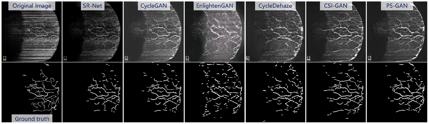 As we mentioned in the dataset section, synthetic stripes were added to the images in the PUTH and ROSE datasets. In order to demonstrate the superiority of the de-striping stage, we compared our SR-Net with the state-of-the-art de-striping methods including CUD, CSD and CSD+ (18), as well as the baseline model (U-Net). Figures 7, 8, top present the stripe noise removal results produced by the different methods. As illustrated in Figure 7, top, SR-Net removes stripe noise more faithfully without losing vessel information comparing with other methods. CSD+ attempts to remove the effect of stripe artifacts from the given images, but it still contains noticeable stripe artifacts. Overall, the proposed SR-Net generate the best performance in eliminating stripe noise, i.e., with more visually informative results.