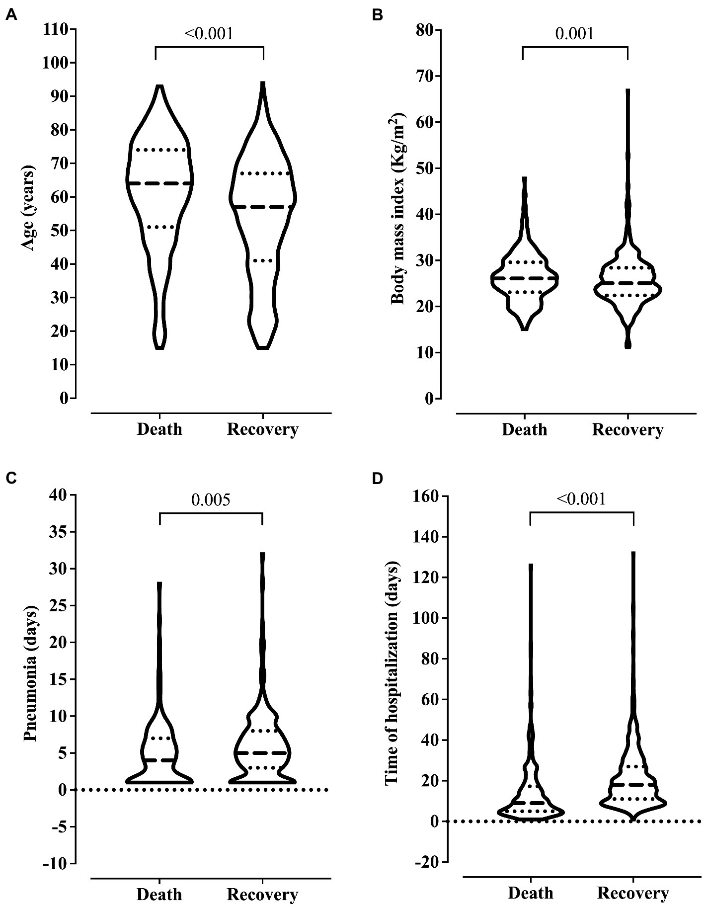 Association between clinical outcome and age (A), body mass index (B), ventilation-associated pneumonia (C), and length of hospital stay (D). We carried out the statistical analysis using the Mann–Whitney test and a 0.05 alpha error.