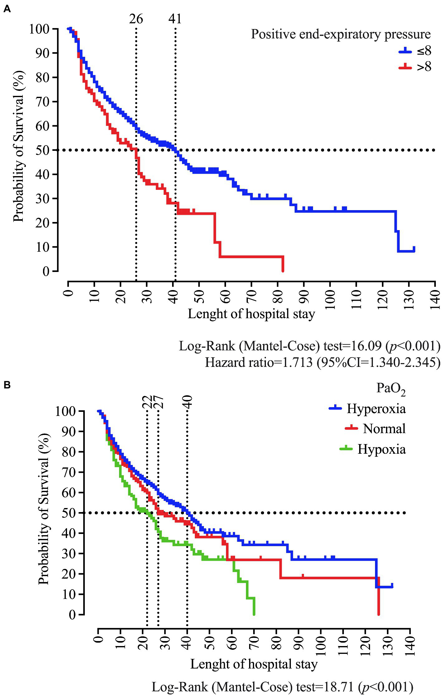We did the survival curve of patients who received IMV according to PEEP at admission and the classification of PaO2 as normal, hypoxia, and hyperoxia at admission. We performed the statistical analysis using the Log-Rank (Mantel-Cose) test. We calculated the Hazard ratio using the PEEP ≤8 cmH2O as the numerator.