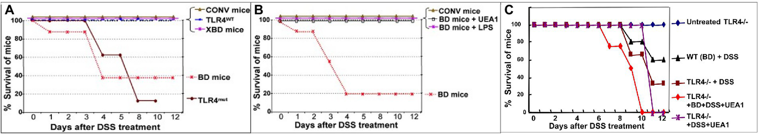 The functional role of fuc-TLR4 signaling in mucosal repair and recovery of homeostasis was investigated by inducing colitis in BD mice. Fully colonized conventional control mice were able to fully recover from chemically induced mucosal injury induced by 3.5% DSS, whereas the same insult in BD mice resulted in 60% mortality (Figure 6A). Restitution of typical mouse microbiota (XBD) allowed full recovery from DSS injury, as does treatment with a fuc-TLR4 ligand, either UEA1 or LPS (Figure 6B). Consistent with the in vitro model, the amount of LPS required to rescue the BD mice from colitis-induce mortality is two orders of magnitude higher than that needed for LPS-mediated sepsis in fully colonized mice. Lectins that do not bind fucose, such as wheat germ agglutinin and Maackia amurensis agglutinin I, did not activate mucosal fucosylation, nor restore the ability to recover from mucosal insult of BD mice. Thus, activation of fuc-TLR4 is the critical feature supporting a return to mucosal homeostasis in BD mice. The essential nature of fuc-TLR4 signaling was reinforced by the inability of UEA1, conventional microbiota, or their combination to reverse DSS-induced damage in TLR4−/− mutants (Figure 6C) or MyD88−/− mutants. Likewise, fuc-TLR4 signaling is also required for recovery from TNBS and OXA, which induce related forms of chemically-induced mucosal injury. Thus, fuc-TLR4 signaling is a critical component for recovery from injury in dysbiotic gut through restoration of mucosal homeostasis.