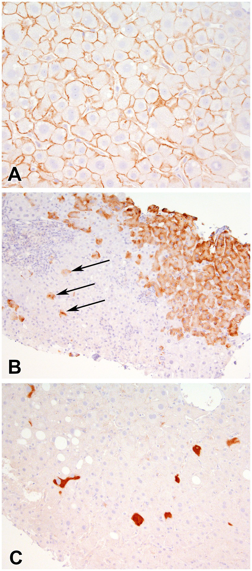Immunohistochemical stain for Hepatitis B Surface antigen showing (A) membranous staining (400x), (B) scattered granular (arrows) and contiguous granular cytoplasmic staining (400X), and (C) inclusion-like (200X) staining of hepatocytes.