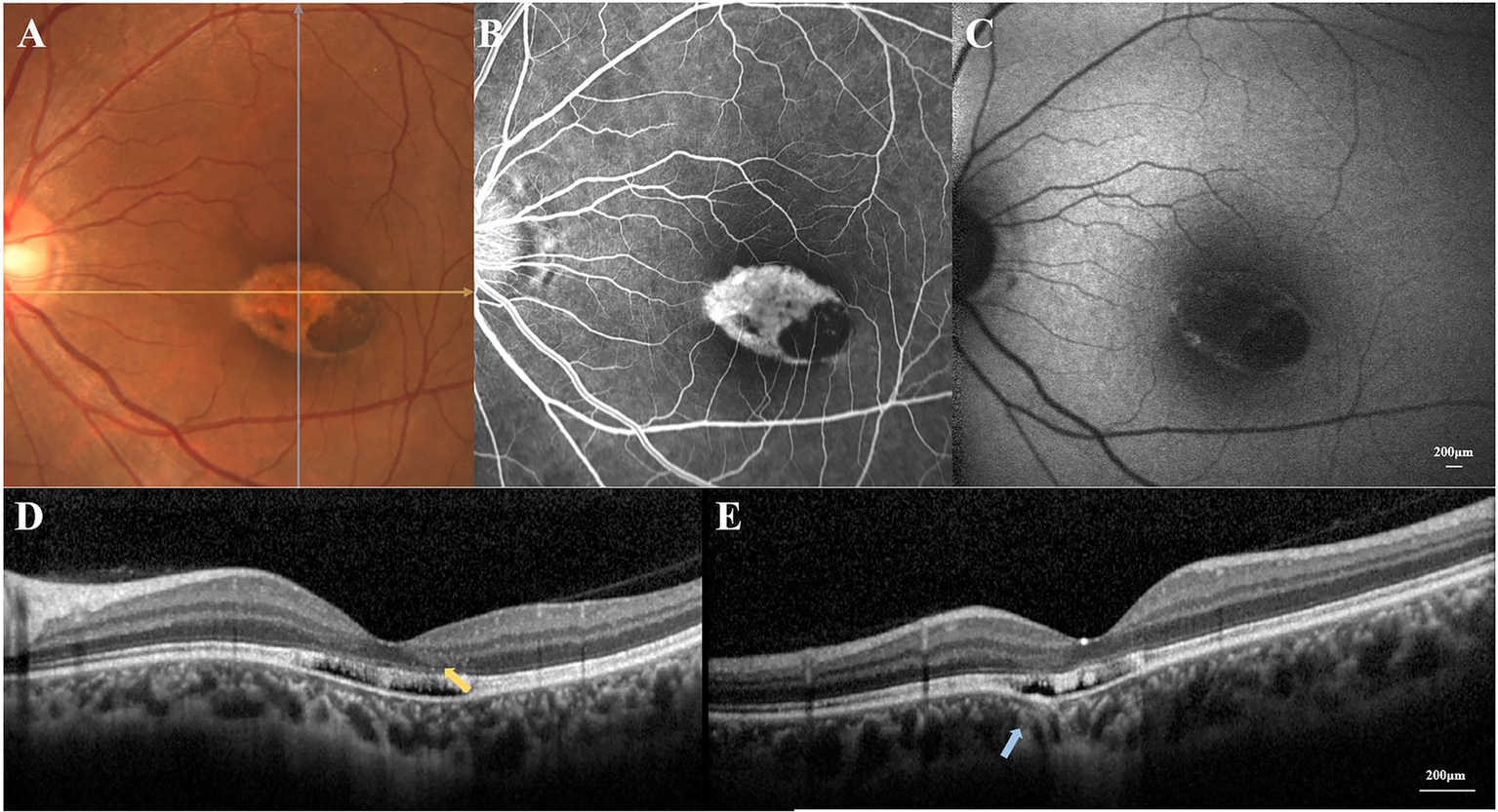 (A) Color fundus photograph revealed a well-circumscribed torpedo-like hypopigmented macula lesion. (B) Fluorescein angiography showed a corresponding window defect without leakage. (C) Fundus autofluorescence demonstrated loss of autofluorescence throughout the lesion with some hyper-autofluorescence signals along the margin. (D) The horizontal OCT scan revealed the disruption of the external retinal, the mild outer retinal cavitation, and the thinning of outer nuclear layer (yellow arrow). (E) The vertical OCT scan showed subtle inner choroidal excavation (blue arrow).