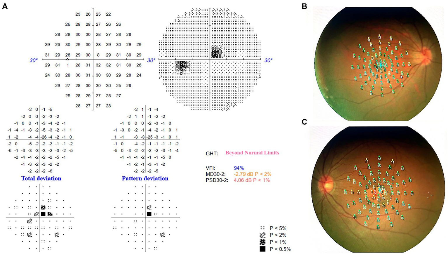 (A) Humphrey static perimetry implied the comparative scotoma in the superior-nasal central visual field of left eye, which was consistent with the location of the macula lesion. (B) Microperimetry revealed normal sensitivity of macula fovea in the right eye. (C) Microperimetry revealed the reduced sensitivity of macula fovea in the lesion area of left eye.