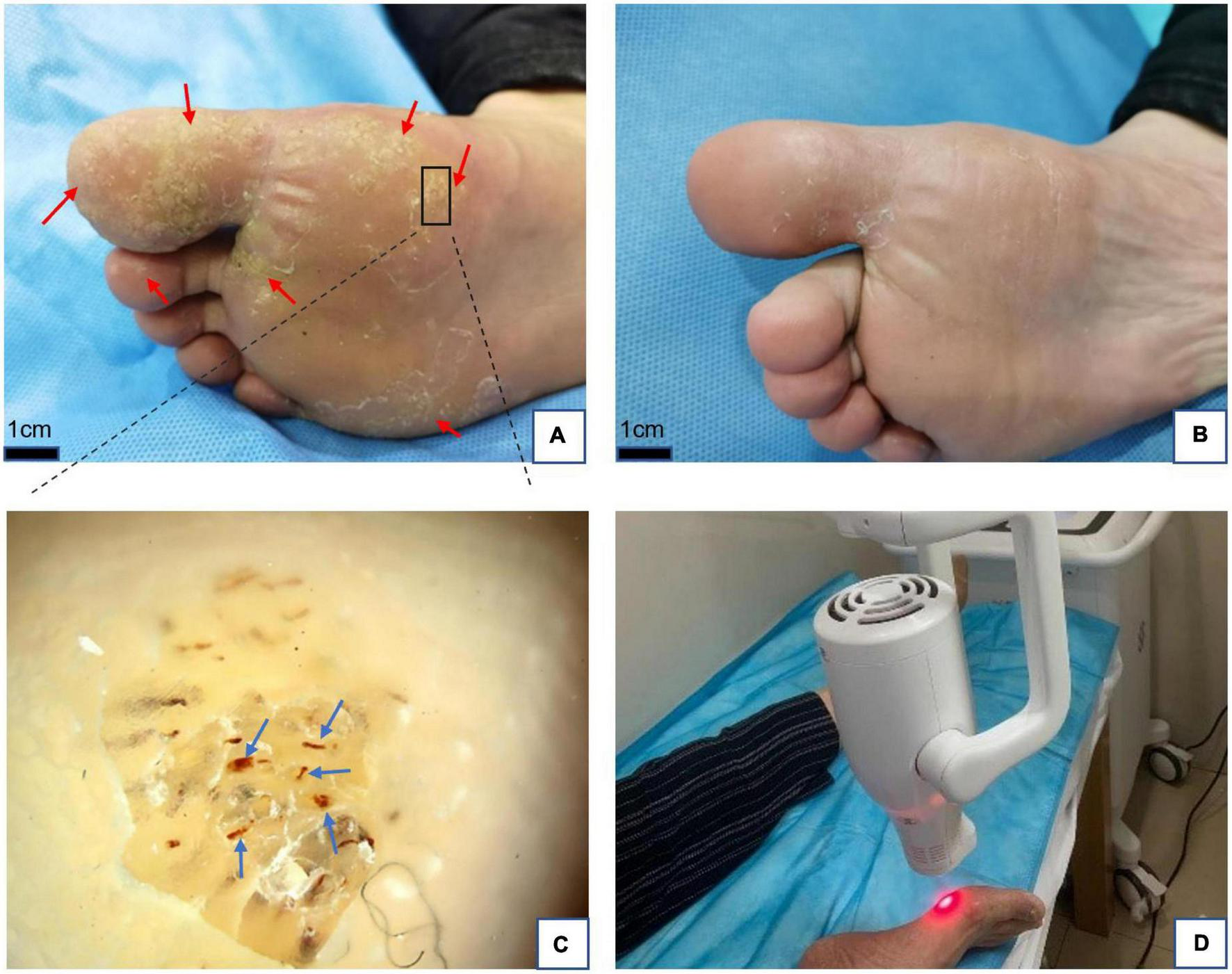 (A) Plantar warts (red arrows) before treatment. (B) Five weeks after treatment with local hyperthermia (complete resolution). (C) Dermoscopic findings in warts, red dots, and linear vessels (blue arrows) on the papilliform surface. Dermoscope 50× magnification. (D) Clinical application of local hyperthermia.