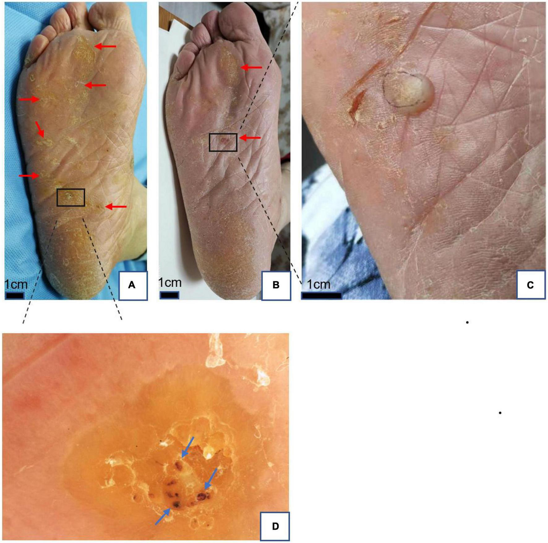 (A) Plantar warts (red arrows) before treatment. (B) Two months after treatment with local hyperthermia (partial remission). (C) Bullae at targeted warts after treatment. (D) Dermoscopic findings in warts; yellowish structureless with bleeding streaks and spots (blue arrows) appearance on the papilliform surface. Dermoscope 50× magnification.
