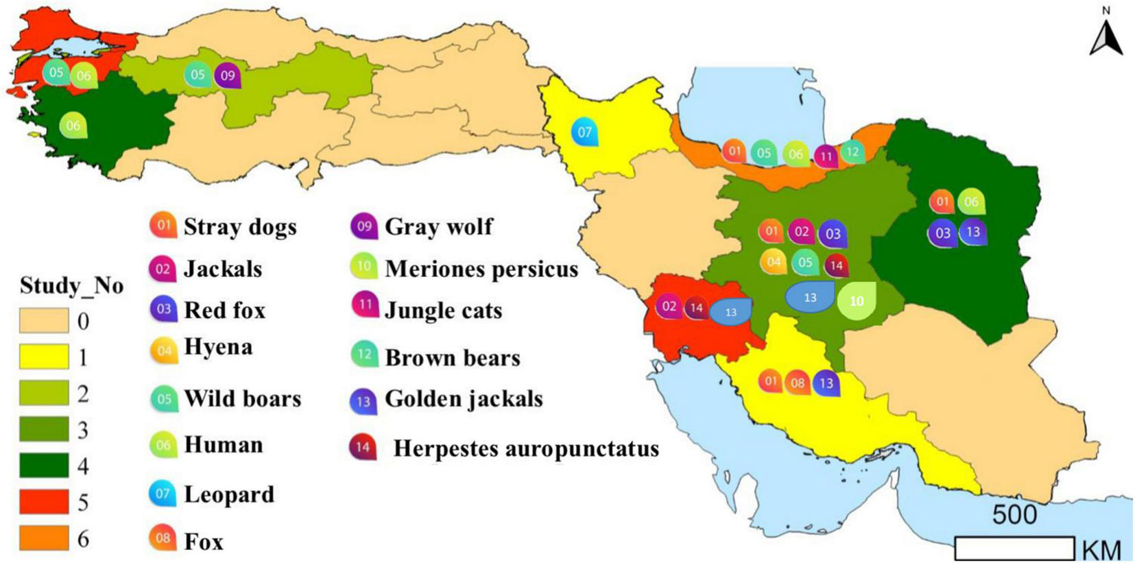Overall, Trichinella sp. has been reported from wild life of the Caspian region, Isfahan, Ardabil, Khuzestan, Khorasan Razavi, and Bandar Abbas in the north, central, northwest, southwest, north-east and of south of Iran. Current data on the distribution of Trichinella taxa is fragmentary. Moreover, most of available data comes from case reports and biological data of the Trichinella taxa in wild animals of Iran is very limited, while no data are available on the distribution of Trichinella taxa in many parts of Iran; thus, more epidemiological studies with larva identification at the species level by molecular tests are still needed for covering the whole country to ascertain the prevalence of Trichinella sp. infection, mode of transmission, and population structure in wild animals of Iran. Experimental studies are needed to elucidate the infectivity and predilection sites of T, britovi genotypes circulating in Iran. In Turkey, only a few studies on T. britovi infection have been published since no data have been reported on human trichinellosis after 2004 and wild boars after 2011. We believe that Trichinella spp. present in wildlife should be explored further, as this would greatly aid our understanding of epidemiology and to implement control strategies.