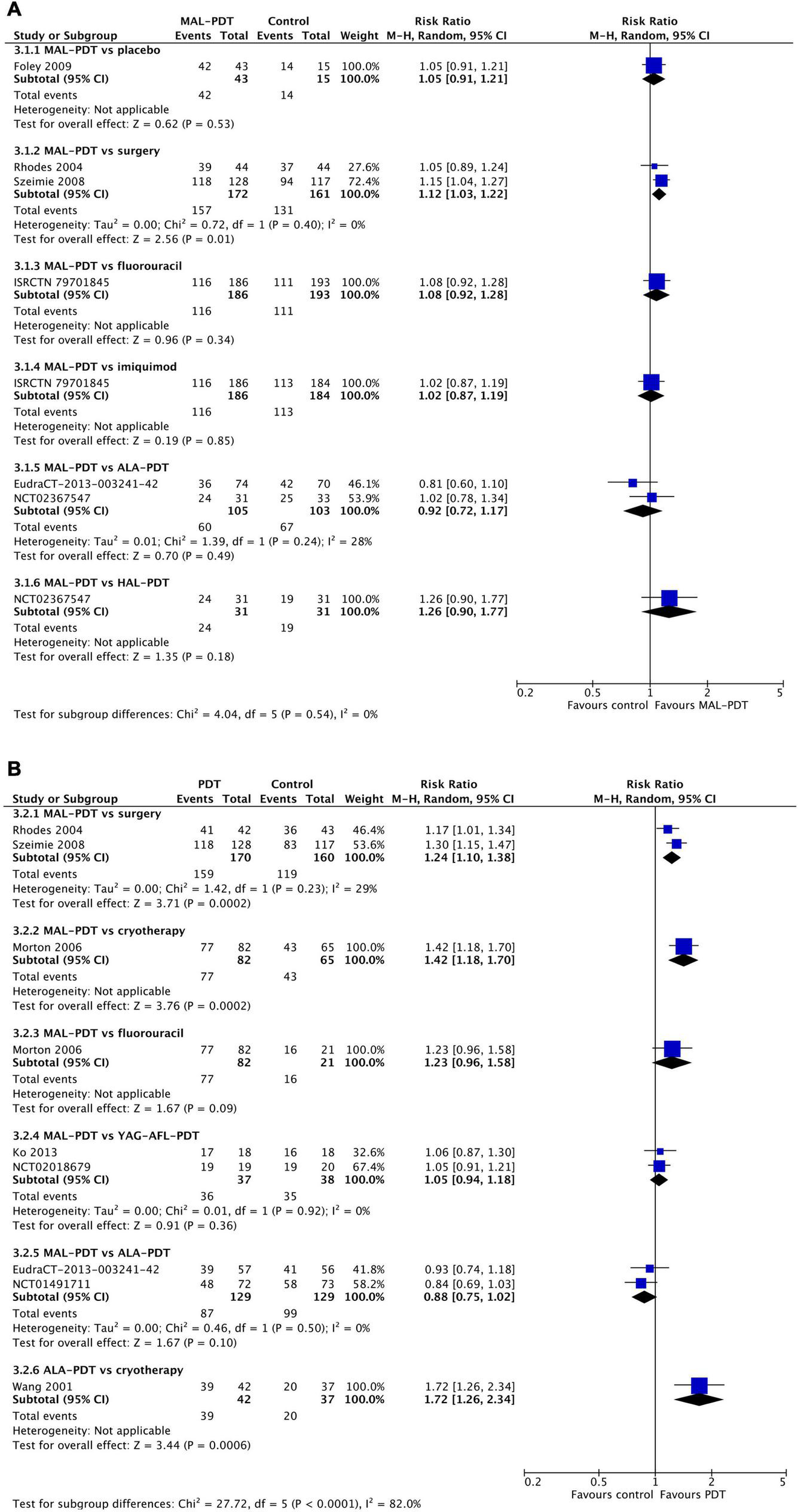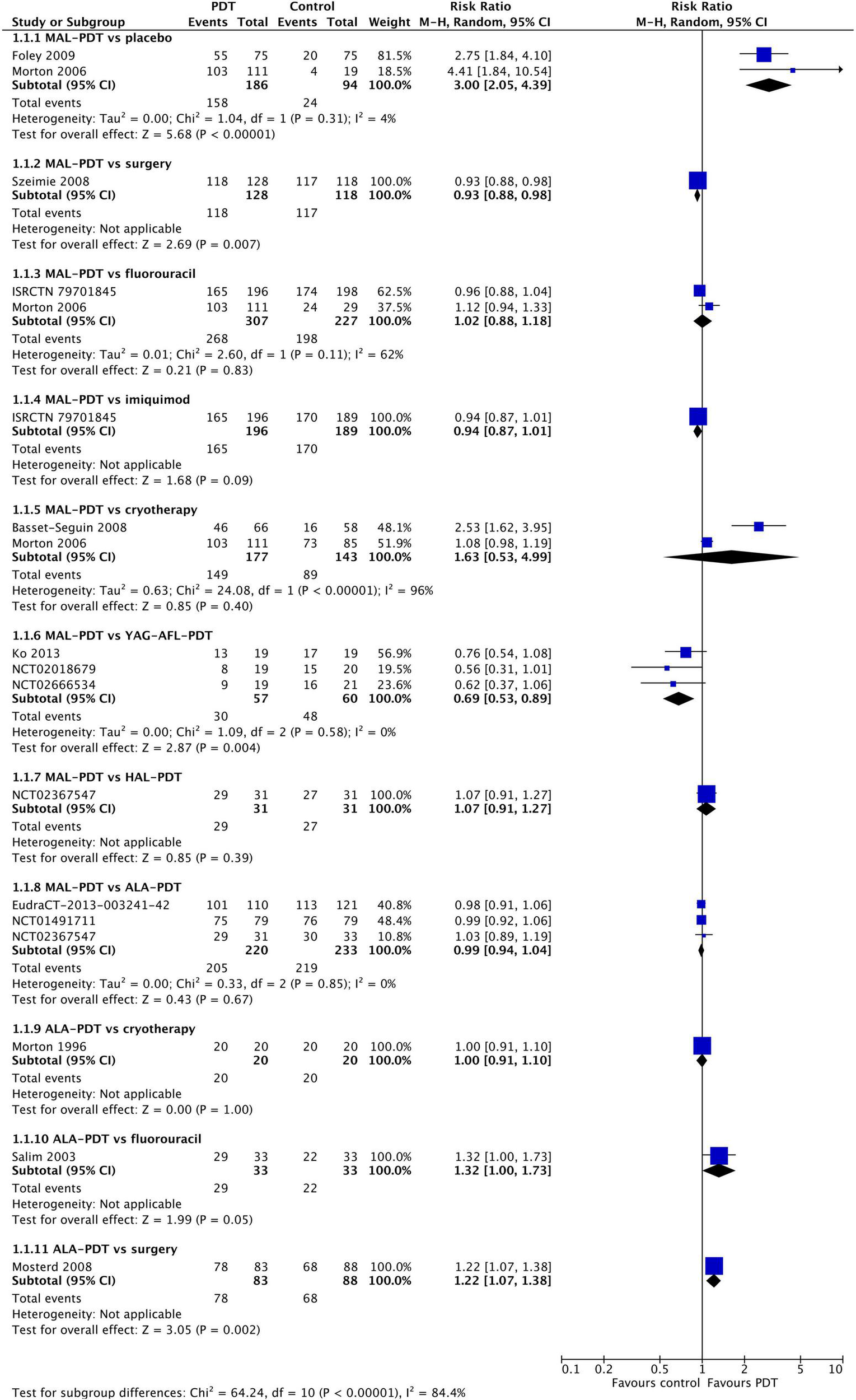 Seventeen unique randomized controlled trials, representing 22 study arms from 21 publications were included. The included trials included 2,166 participants, comparing methyl aminolevulinic (MAL) PDT (six studies) or aminolevulinic acid (ALA) PDT (two studies). Comparators included placebo, surgery, hexaminolevulinic (HAL) PDT, erbium: yttrium-aluminum-garnet ablative factional laser (YAG-AFL) PDT, fluorouracil, and imiquimod. There were few studies available for each comparison. Mantel-Haenszel fixed effects risk ratios were calculated for response, recurrence, cosmetic outcomes, and adverse events. MAL-PDT had similar response rates to surgery, ALA-PDT, fluorouracil and imiquimod at 3- and 12 months post-intervention. The rate of recurrence was similar, showing few differences at 12 months, but at later time points (24–60 months), fewer lesions recurred with surgery and imiquimod than with PDT. PDT also caused more adverse events and pain than other interventions. However, PDT treatment was more likely to receive a “good” or “excellent” rating for cosmetic appearance than surgery or cryotherapy.