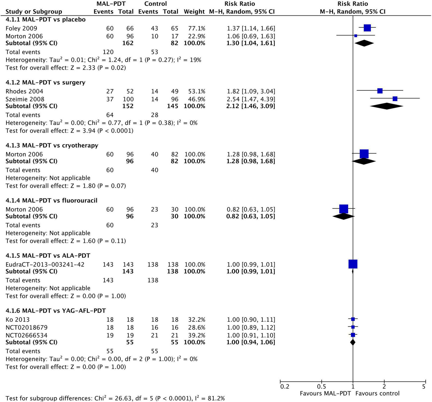 All clinical trials reported on response at 3 months post-treatment (Figure 2). MAL-PDT was significantly superior to placebo (two studies; RR: 3.00 (95% CI: 2.05 to 4.39); P < 0.00001), but statistically less effective than surgery (one study) and YAG-AFL-PDT (three studies). No other comparisons were statistically significant.