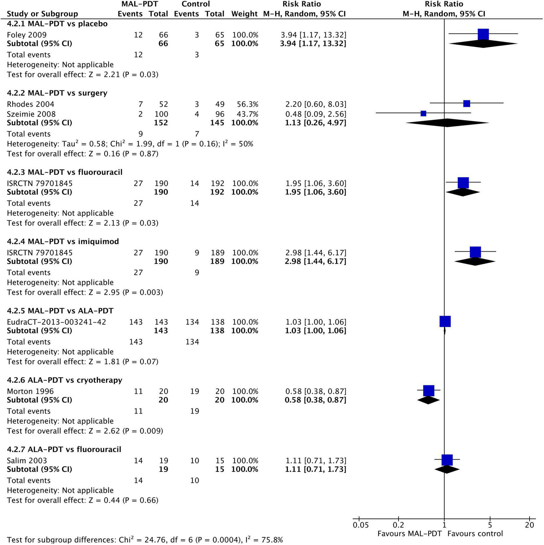 The incidence of pain during the procedure was higher in people who had MAL-PDT than imiquimod, fluorouracil, or placebo (one study per comparison; Figure 8), and lower in those undergoing ALA-PDT than cryotherapy (one study). There was no difference in the incidence of pain between MAL-PDT and ALA-PDT (one study), between ALA-PDT and fluorouracil (one study), and between MAL-PDT and surgery (two studies). There were too few studies to undertake meta-regression. Peak pain severity showed a slightly different picture. The only statistically significant difference in pain intensity was between ALA-PDT and surgery (one study; Supplementary Figure 6).