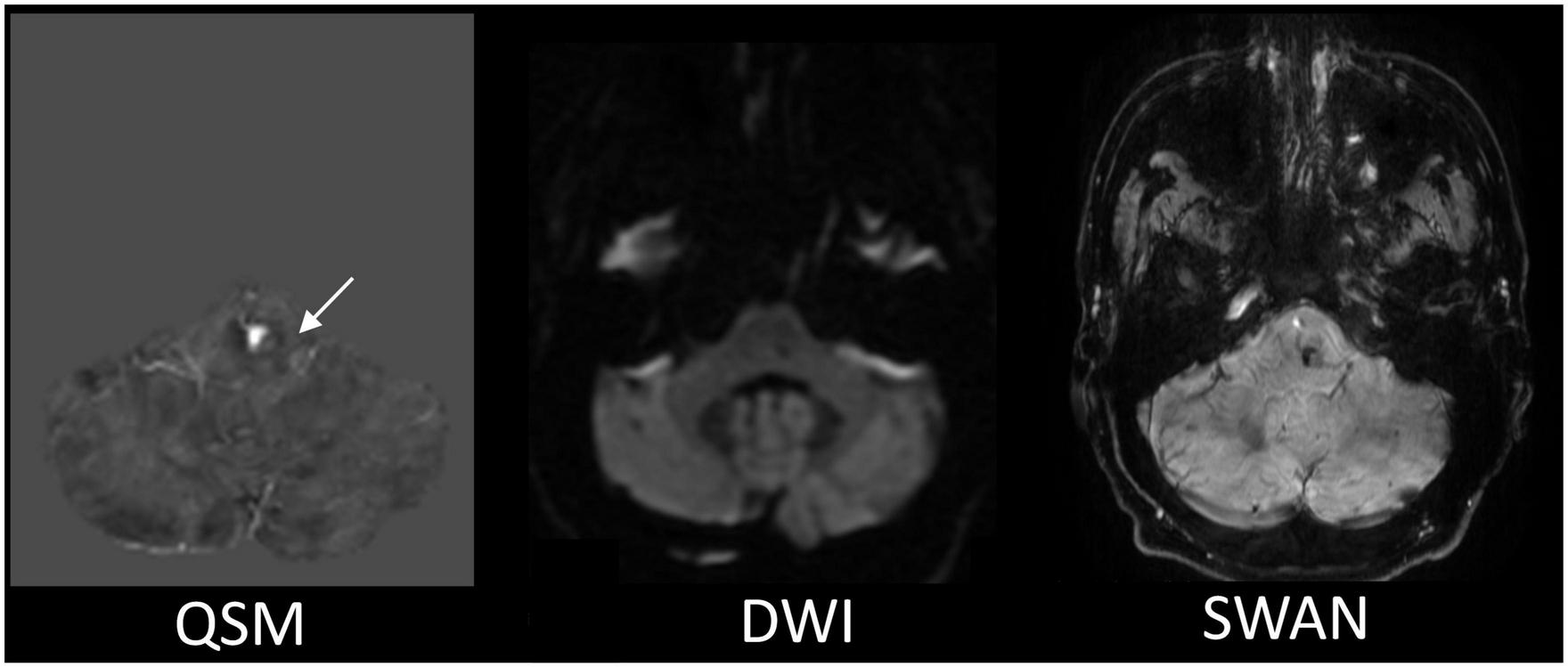 The representative MR images comparison for the CCM detection. The QSM displays the most apparent boundary of the CCM from among all the MR images we acquired. The white arrow is pointing to the location of the CCM.