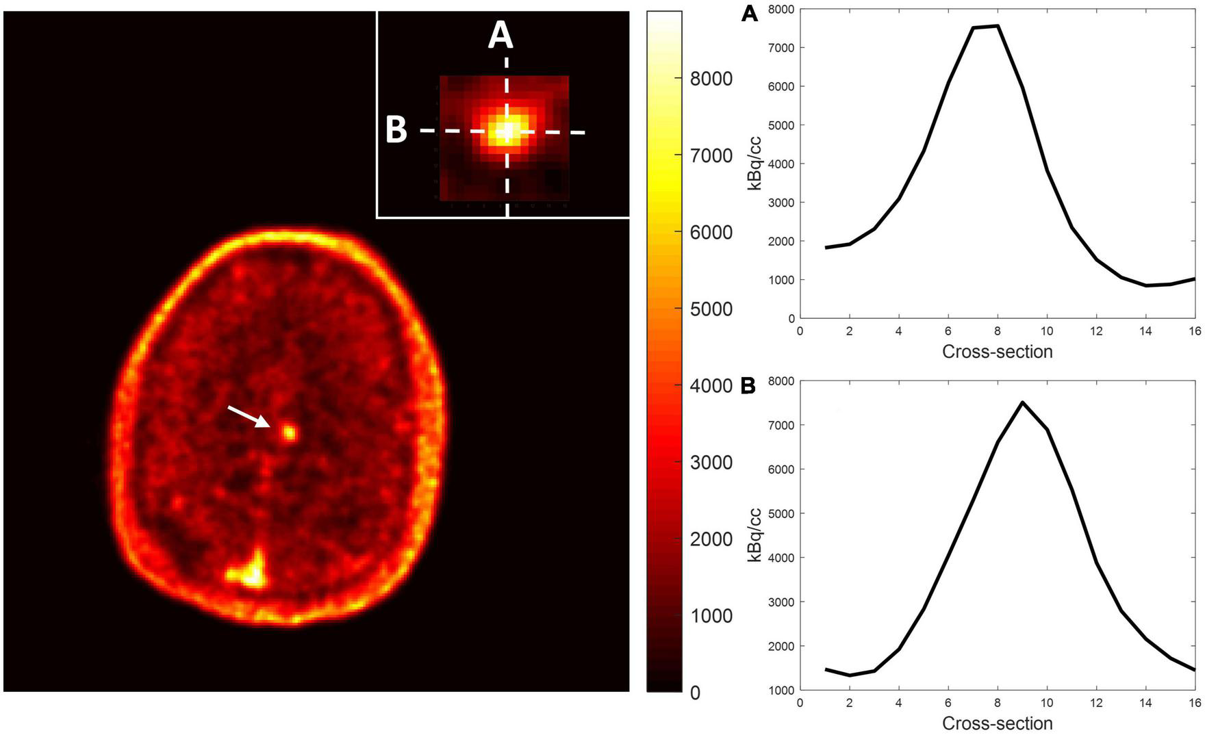 Representative image contrast of flutriciclamide PET across the CCM lesion. Display vertical (A) and horizontal (B) cross-sections of CCM and nearby brain tissue areas.