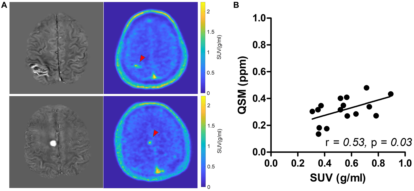 (A) Comparison of QSM (left) and SUV map of flutriciclamide (right) of two representative cerebral cavernous malformations (CCM) cases. The red arrow points at the CCM lesion in the brain. (B) Correlation of flutriciclamide SUV and QSM in CCM lesion.