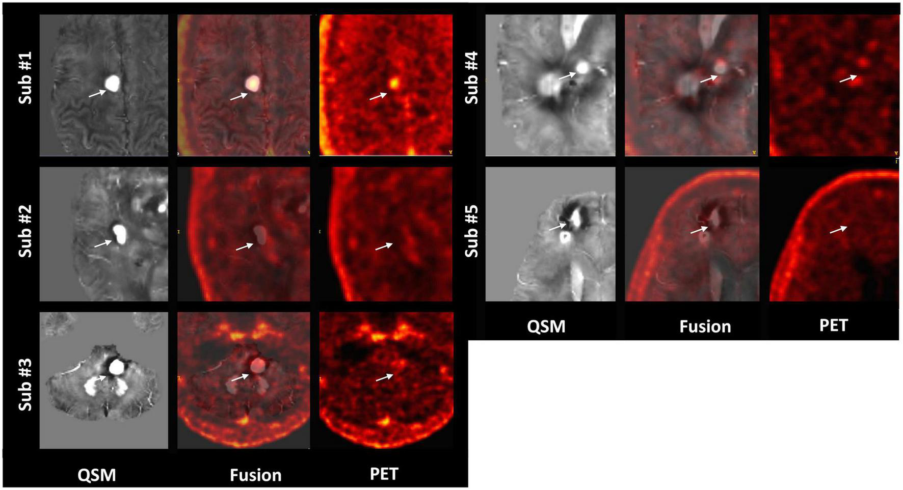 Representative QSM and matched flutriciclamide PET images demonstrate the heterogeneity of the CCM lesions for all CCM patients. The white arrow is pointing to the location of the CCM.