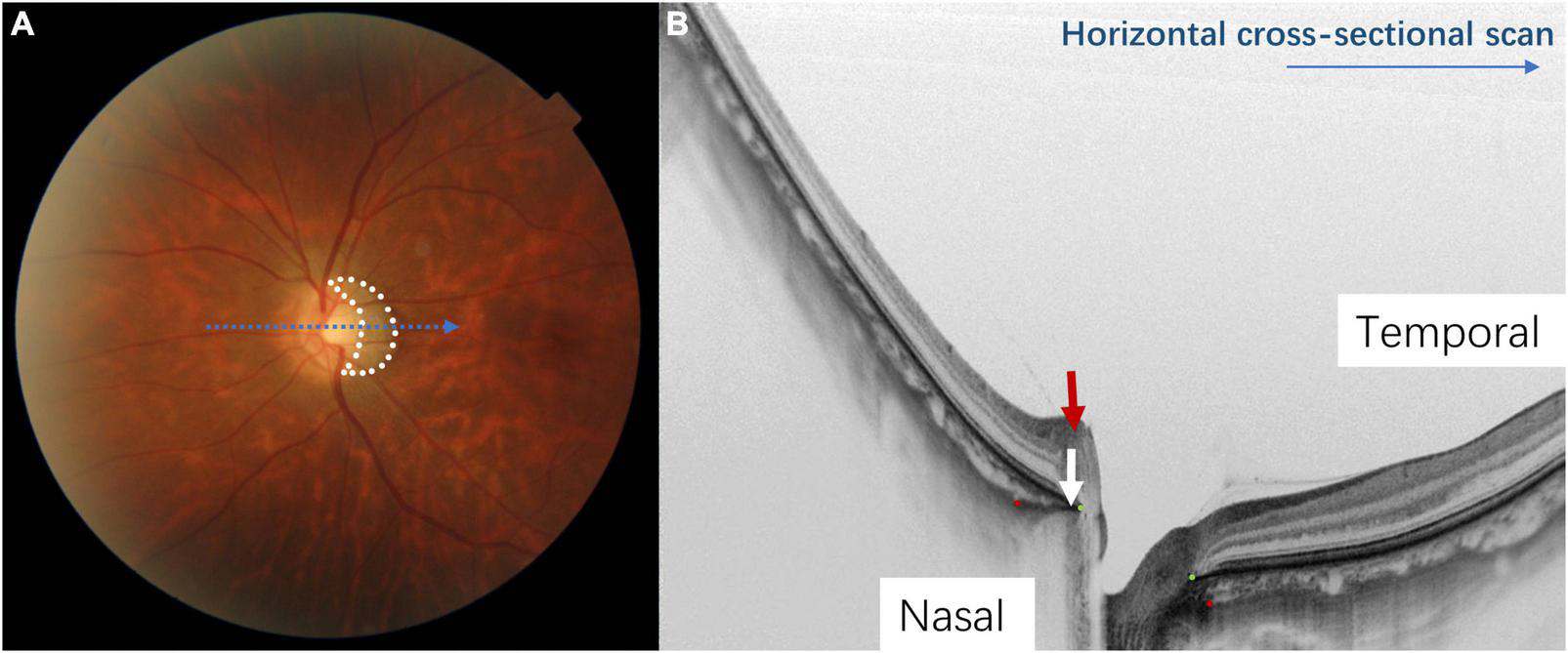 Myopic tilted disc is one of the most common morphological changes found in myopic eyes. It appears as oval-shaped and obliquely rotated ONH, often separately described as optic disc tilt and optic disc torsion, respectively, according to different definitions (4). Myopic tilted disc could lead to alteration of the retinal nerve fiber layer (RNFL) peak locations, changes of the macular ganglion cell inner-plexiform layer (GCIPL) distribution (5–9). It can also cause structural changes of the sclera (10), choroid thickness (11–13), and microvasculature (14–16). It is also a mediator between the presence of peripapillary hyperreflective ovoid mass-like structure (PHOMS) and myopic shifting in children (17, 18). Furthermore, myopic tilted disc is associated with an increased risk of developing RNFL defect (19–24). These structural changes could render myopic eyes more susceptible to axonal loss. They may ultimately lead to the development of glaucomatous damage and subsequently irreversible visual impairment and even blindness (25, 26). Furthermore, the changes of RNFL, GCIPL, and optic disc morphology also cause difficulties in diagnosing glaucoma and disease monitoring (27, 28). This is one of the most encountered diagnostic dilemmas in ophthalmology practice.