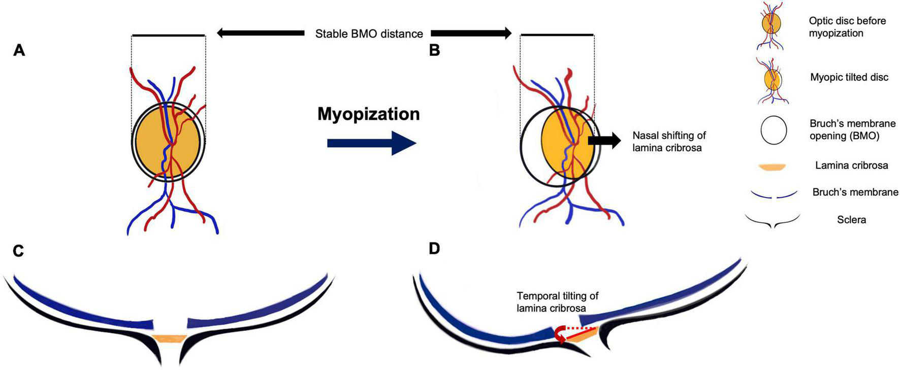 Myopia is thriving as an epidemic in many parts of the world especially in the developed countries of East and Southeast Asia, mounting a prevalence of 80–90%, with a 10–20% prevalence of high myopia among young adults (1, 2). By 2050, approximately 4,758 million, or almost half of the global population, could become myopic, with as much as 10% highly myopic (3). High myopia–usually defined as refractive error of <−6.00 diopters (D) and axial length of ≥26.5 mm–is associated with various structural changes, including optic nerve head (ONH) deformity, retinal stretching, and posterior scleral expansion. The ONH is where retinal ganglion cell axons exit, accompanied by retinal blood vessels. It is one of the most affected structures by myopia progression (or myopization).