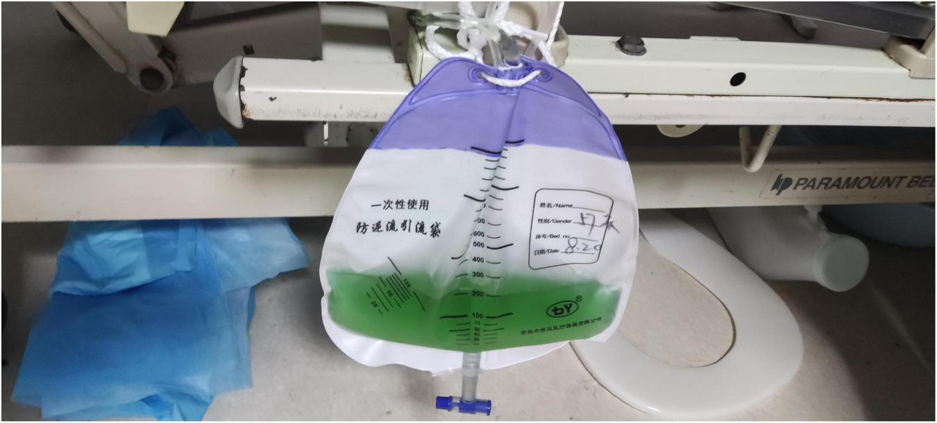 The patient had 70% methemoglobin initially, with cyanosis of the skin and mucosa. The patient was in a coma and critical condition. Immediately after the patient was transferred to our hospital, methylene blue was administered, the patient’s symptoms improved significantly, and the methemoglobin level reduced to 11.1%. The current recommended treatment for nitrobenzene poisoning is based on decontamination principles and symptomatic and supportive treatments. Methylene blue is the first choice of antidotes for acquired (toxic) methemoglobin, which serves as an electron acceptor after entering the body to reduce methemoglobin to hemoglobin (10), which can participate in oxygen transport. However, excessive administration of methylene blue may cause accumulation in the body, resulting in secondary methemoglobinemia. At the same time, G6PD level should be tested because methylene blue is not recommended for patients with G6PD deficiency. Within 3–6 h after injecting methylene blue into the human body, blue-green urine is observed (11). Gradually, the color becomes light green-yellow to yellow to pale yellow and then becomes light yellow after approximately 72–96 h. Nicotinamide adenine dinucleotide phosphate metabolizes methylene blue into leucomethylene blue, which is mainly excreted in the urine, turning the urine color blue-green (12). Some scholars believe that it may be related to biliverdin, an in vivo bilirubin oxidation product (13, 14).
