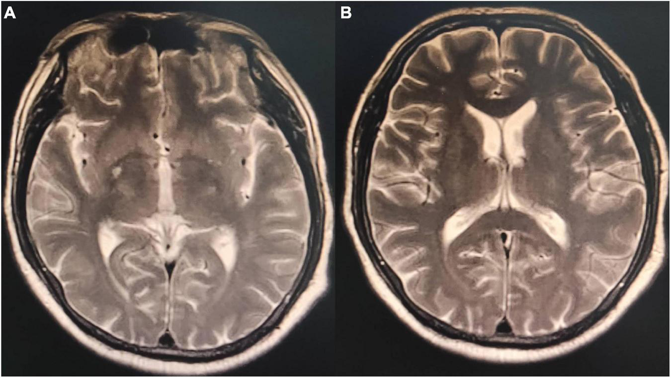 Nitrobenzene is an oxidizing nitrite compound (5) that can cause human poisoning when 35 mg/kg is absorbed. The skin absorbs nitrobenzene at 2 mg/(cm2⋅h) rate. Moreover, nitrobenzene vapor can be absorbed via the skin and respiratory tract simultaneously, with a total retention rate in the body reaching 80% (6). Methemoglobinemia caused by nitrobenzene poisoning is the main pathological basis of acute poisoning. The intermediate substance formed during its biological transformation in the body causes red blood cell rupture and hemolysis. After entering the human body, nitrobenzene is transformed to produce intermediate products, which can lead to the reduction of reduced glutathione. Reduced glutathione plays an important role in the survival of red blood cells, such as in the maintenance of the normal function of red blood cell membrane. When reduced glutathione is decreased, it is easy to cause hemolysis. The intermediates also directly act on the basophobia in globin molecules to promote denaturation. The denatured globin condenses into precipitates and forms inclusion bodies (Hearn corpuscles) in red blood cells. The red blood cells containing Hearn corpuscles are easily ruptured, which is another reason for hemolysis. The red blood cell count decreases rapidly within 3-4 days but gradually increases after 1-2 weeks with active treatment. Furthermore, nitrobenzene poisoning can cause liver and kidney dysfunction, which usually occurs 2–3 days after the poisoning. Other symptoms include cardiogenic pulmonary edema and multiple organ dysfunction (7). The neurological symptoms of nitrobenzene poisoning are apparent, with excitation symptoms such as dizziness, headache, lethargy, and coma occurring earlier. The initial symptoms of the patient were obvious, which included high fever in the summer, acute attack after several hours of skin exposure, loss of consciousness, coma, and lip cyanosis. The patient had a history of cerebral infarction, but no obvious neurological symptoms occurred during hospitalization. Moreover, no abnormalities were observed in the early brain CT. However, MRI revealed right basal ganglia and bilateral white matter lesions 7 days after admission, indicating toxic encephalopathy caused by nitrobenzene poisoning. Current neurologic symptoms (headache, confusion, and coma) after nitrobenzene poisoning are usually interpreted as methemoglobinemia complications from the resulting cerebral hypoxia. However, some studies suggested that CT and MRI reveal targeted brain lesions rather than hypoxic encephalopathy. Moreover, toxic encephalopathy occurs more in the cerebellum and brainstem, and most of the lesion sites are symmetrically distributed (8). However, other sites cannot be excluded.