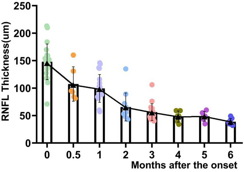 Scattered distribution and changes in the average thickness of RNFL with the course of the disease.