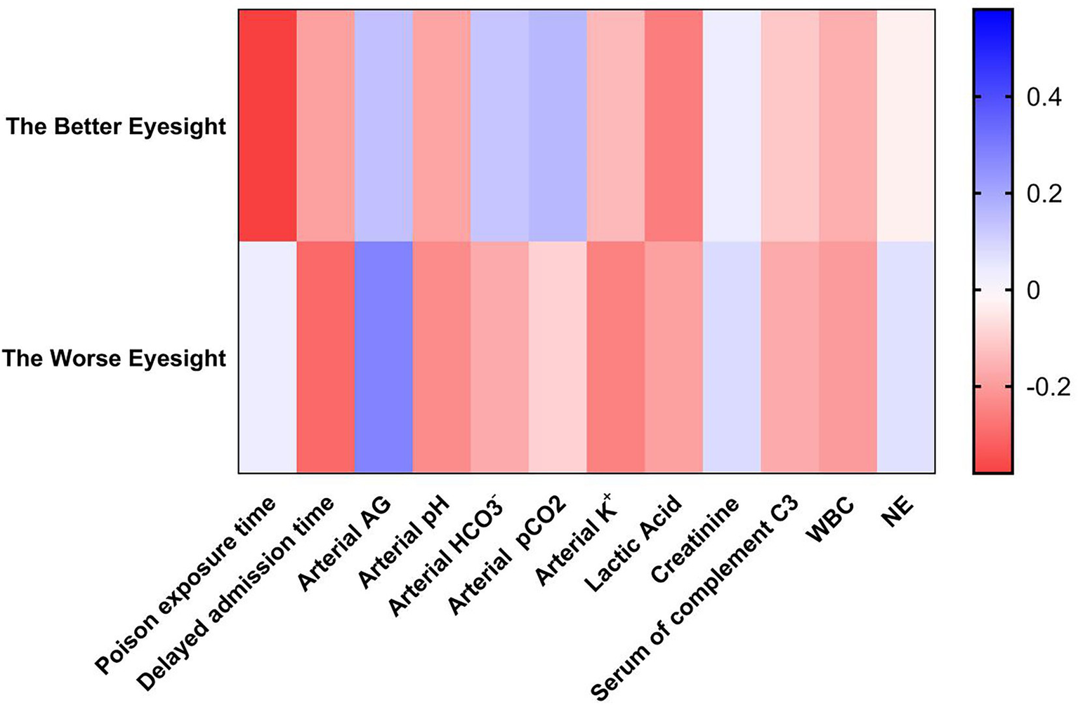 Spearman’s analyses were used to analyze the correlation between the BCVA prognosis and various laboratory tests. The results showed that the factors that had a greater correlation with the better prognosis of BCVA were the time of exposure to toxicants (r = −0.38; p = 0.035) and blood lactate (r = −0.26; p = 0.043). The factors that had a greater correlation with the worse VA prognosis were delayed admission time (r = −0.3; p = 0.031) and arterial blood AG (r = 0.28; p = 0.035). The parameters with smaller correlations were arterial blood pH (r = −0.23; p = 0.046) and blood potassium concentration (r = −0.21; p = 0.050). Eyes with better VA prognosis were referred to as the better vision of the patient’s binocular vision. Eyes with worse VA prognosis were referred to as the worse vision of the patient’s binocular vision (Table 4; Figure 5).