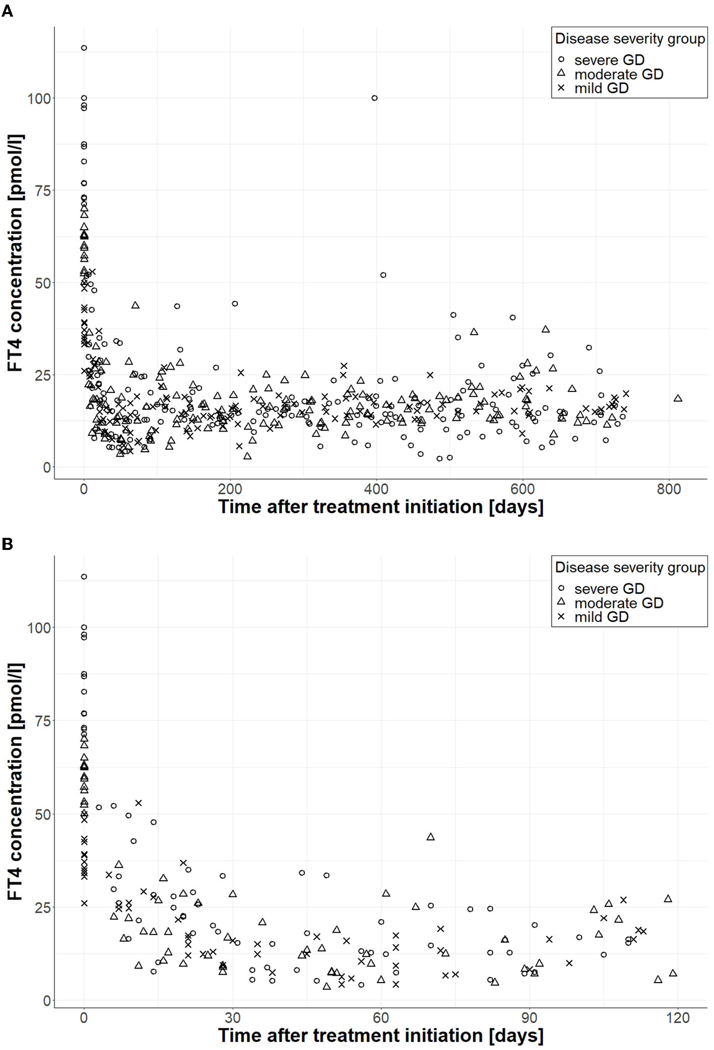 FT4 measurements according to disease severity during follow-up. (A) Shows FT4 measurements during the whole follow-up (n = 494), and (B) displays FT4 measurements during the first 120 days (n = 129); circles correspond to FT4 measurements of patients with severe GD, triangles belong to patients with moderate GD, and crosses correspond to patients with mild GD.
