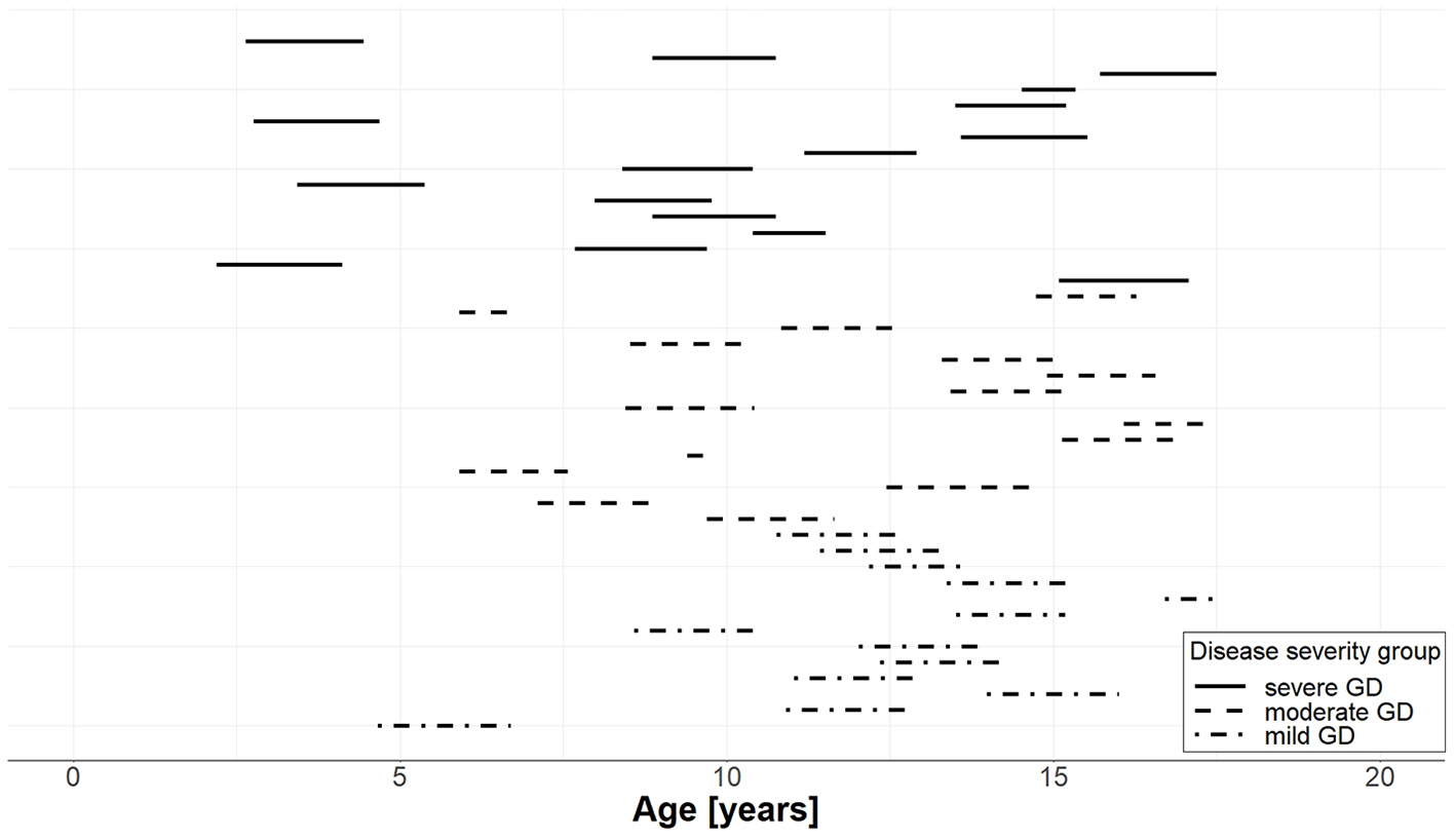 Years of follow-up for each of the 44 individual patients with GD per severity group. The start of the line represents the age at the start of pharmacotherapy and the length of the line represents the duration of follow-up; solid lines correspond to patients with severe GD, dashed lines to patients with moderate GD, and dash-dotted lines to patients with mild GD.