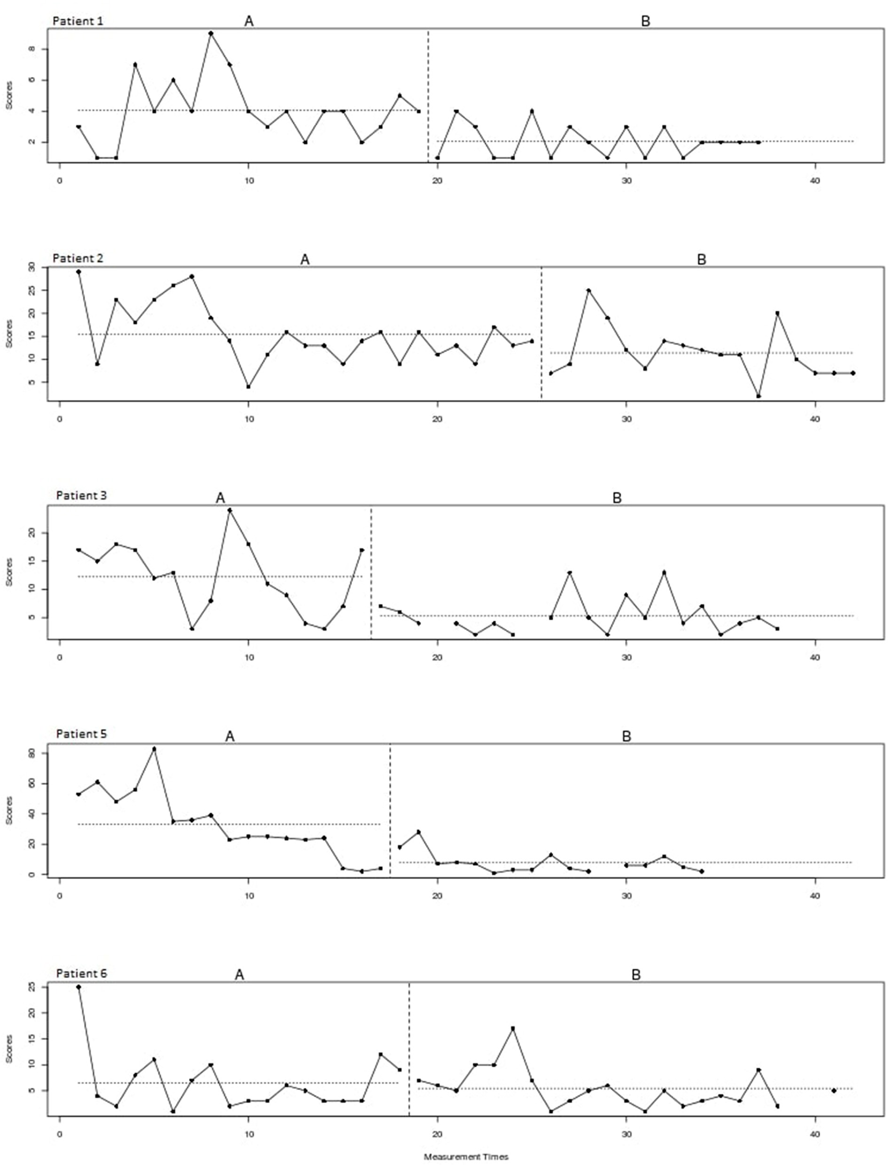 Figure 2 shows the plots of the individual patients. The vertical dotted lines represent the end of the baseline (A) and the start of the intervention phase (B). The horizontal lines represent the mean of scratching behavior for both phases. The visual inspection of the individual patterns in Figure 2 shows a decrease in the scratching behavior for all patients after starting with the intervention. In most patients the scratching behavior fluctuated heavily and a negative trend is already visible during the baseline phase. Please note that patient 5 underwent a change of medication during the intervention phase.
