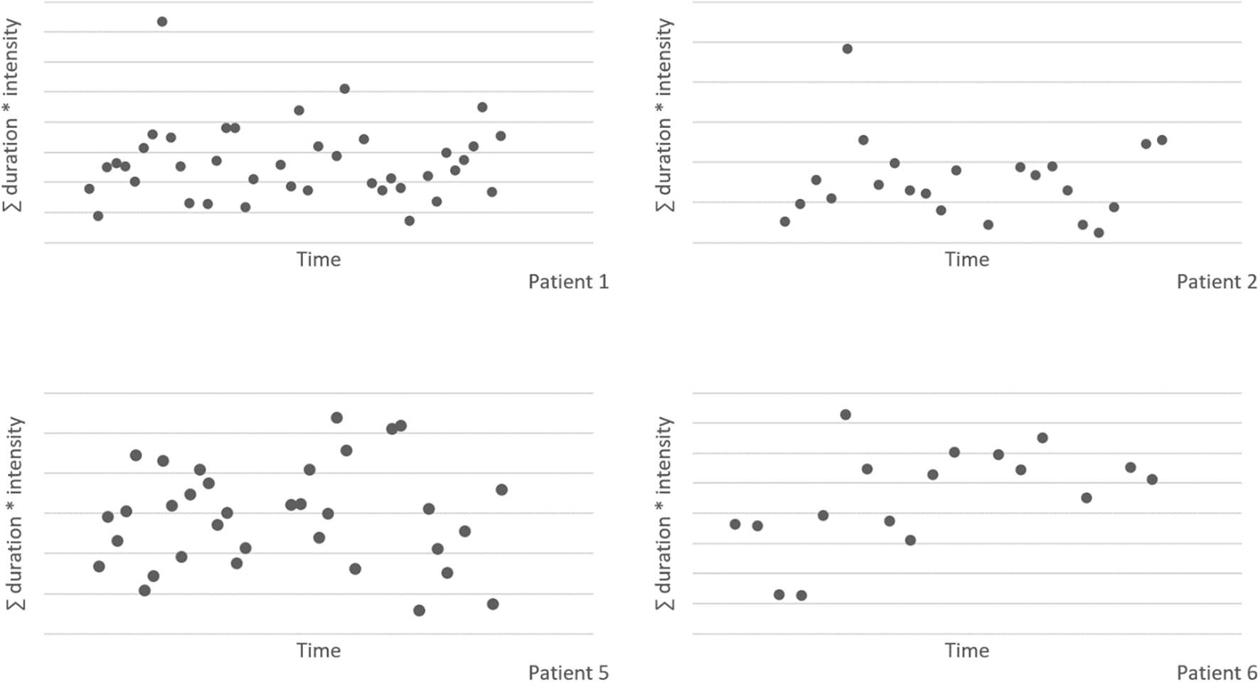 Figure 3 shows the sum of the duration and intensity of nocturnal scratching behavior for all patients, measured with the smart watch application. Due to technical problems with the smart watch application, the nocturnal scratching data of patient 3 is excluded from the figure. There appears to be no effect of the intervention on the nocturnal scratching behavior. There is a large spread, and no clear trend is visible over time.