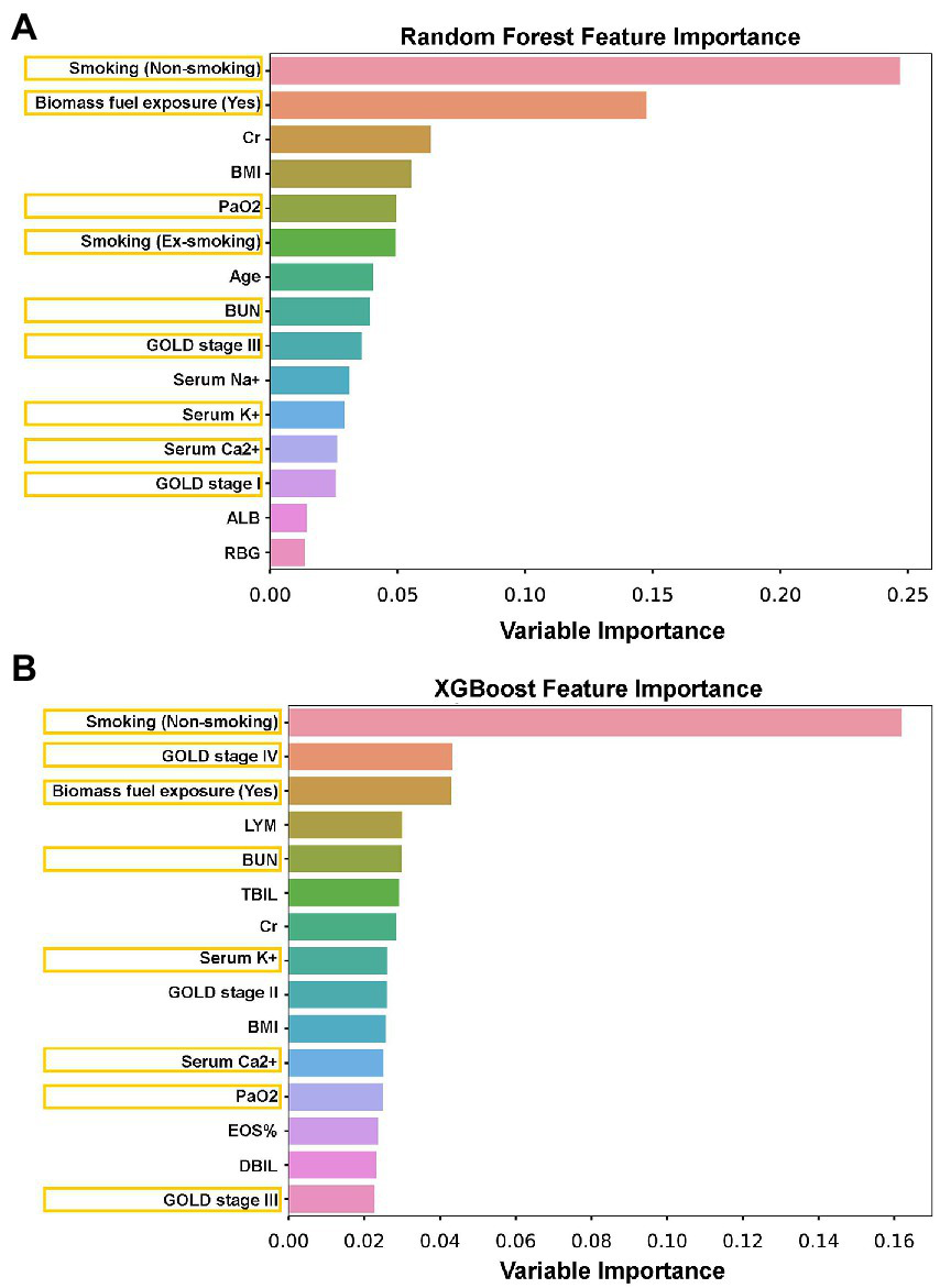Overall, our results support that the clinical features differ markedly by sex in AECOPD. Male patients presented worse lung function and oxygenation, less biomass fuel exposure, more smoking, renal dysfunction, and hyperkalemia than female patients with AECOPD. Furthermore, our results also suggest that machine learning is a promising and powerful tool in clinical decision-making.
