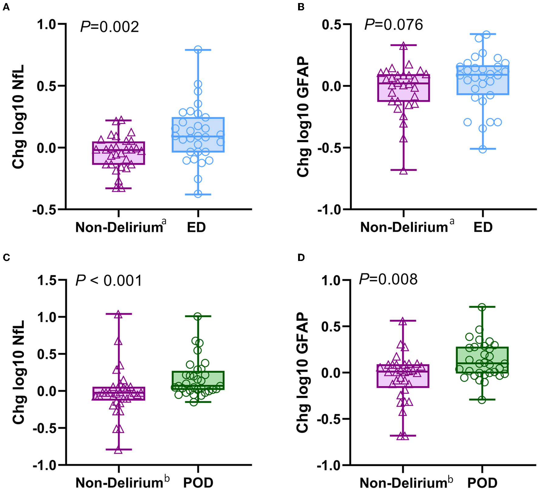 Changes of intraoperative NfL and GFAP levels in patients with different types of delirium. (A, B) Intraoperative changes in plasma NfL and GFAP between the ED and non-delirium patients (n = 60). (C, D) Intraoperative changes in plasma NfL and GFAP between the POD and non-delirium patients (n = 64). The changes were normalized by log10-transforming the postoperative value and the baseline value and then subtracting the transformed preoperative value from the transformed postoperative value. aThe control group of the ED group obtained from PSM; bthe control group of the POD group obtained from PSM. NfL, neurofilament light chain; GFAP, glial fibrillary acidic protein; ED, emergence delirium; POD, postoperative delirium.