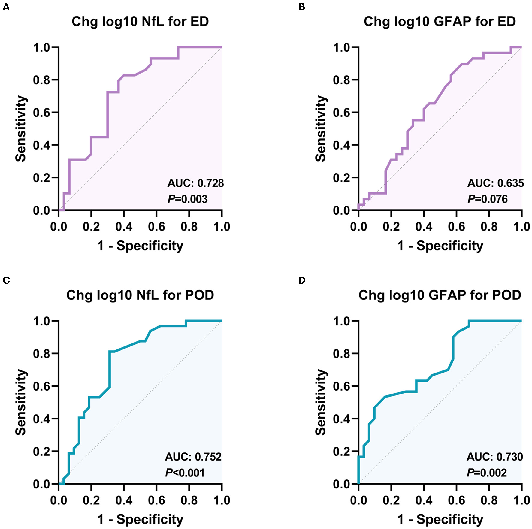 Receiver operating characteristic (ROC) curves for the diagnostic value of NfL and GFAP changes for different delirious types. (A) ROC curve for the classification ability of plasma NfL to distinguish ED from non-delirium patients (n = 60); (B) ROC curve for the classification ability of plasma GFAP to distinguish ED from non-delirium patients (n = 60); (C) ROC curve for the classification ability of plasma NfL to distinguish PD from non-delirium patients (n = 64); (D) ROC curve for the classification ability of plasma GFAP to distinguish PD from non-delirium (n = 64). ED, emergence delirium; PD, postoperative delirium; NfL, neurofilament light chain; GFAP, glial fibrillary acidic protein.