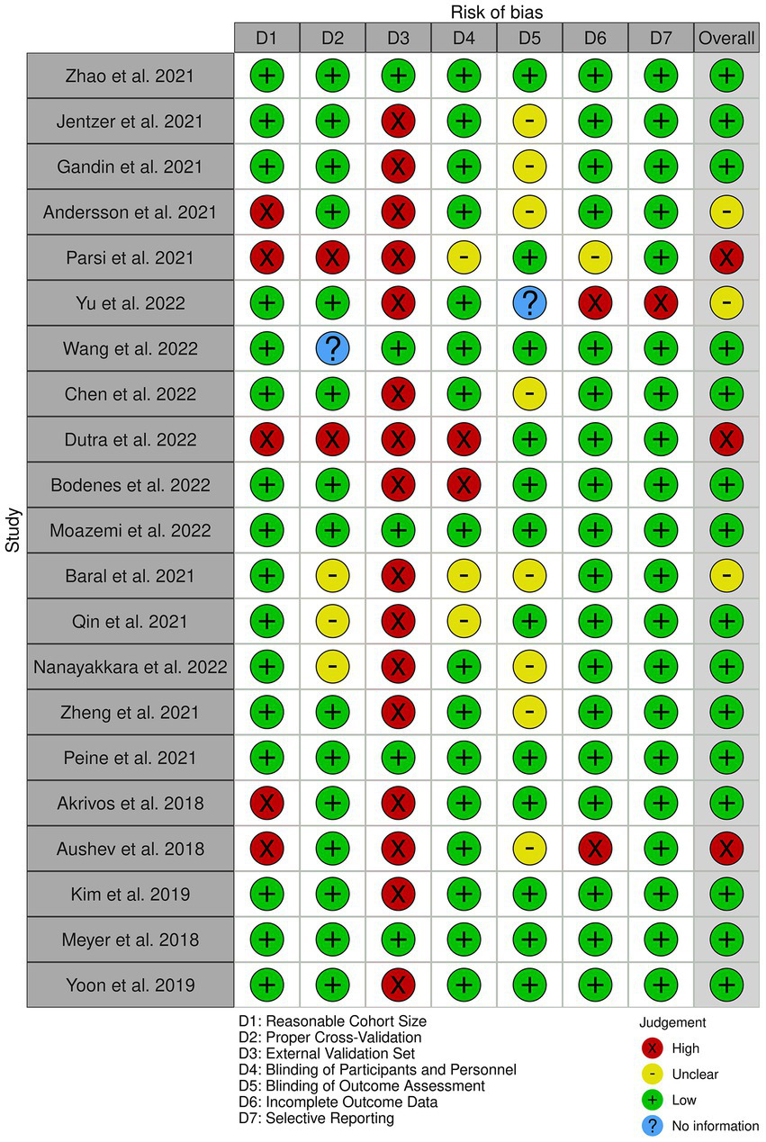 To visualize the risk of bias assessment results, the robvis package (73) is used. As the criteria for risk of bias, the following seven items have been considered: reasonable cohort size (D1), proper cross-validation (D2), external validation set (D3), blinding of participants and personnel (D4), blinding of outcome assessment (D5), incomplete outcome data (D6), and selective reporting (D7). To account for subjectivity, the bias assessment was conducted with the same approach as for the study selection, i.e., with random assignments to two reviewers followed by a final validation by a third expert.
