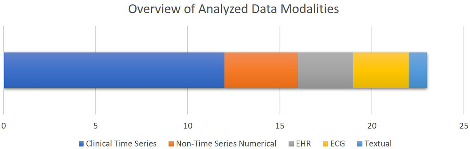 From a general perspective, one can subdivide medical data modalities into the following subgroups: structured data (with and without timestamp) and unstructured data such as medical image modalities and electronic health records (EHR). Like other fields of data science, numerical tabular information such as patient demographic information (e.g., age and weight) can be used to form feature vectors for AI- and ML-based methods. In case of time-dependent measurements such as lab values and vital signs, the dimension of time (i.e., timestamp) should be integrated in the corresponding analysis pipeline, hence the clinical time series data. This section provides a brief overview of different data modalities used in the scope of this systematic review.