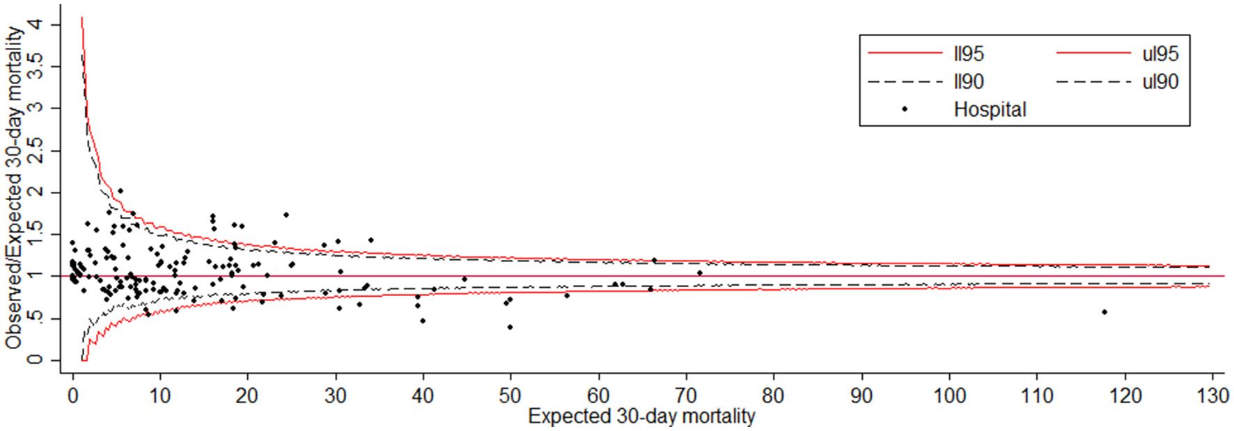 In addition, we constructed funnel plots to determine outliers for 30-day mortality according to Spiegelhalter's methodology (11).